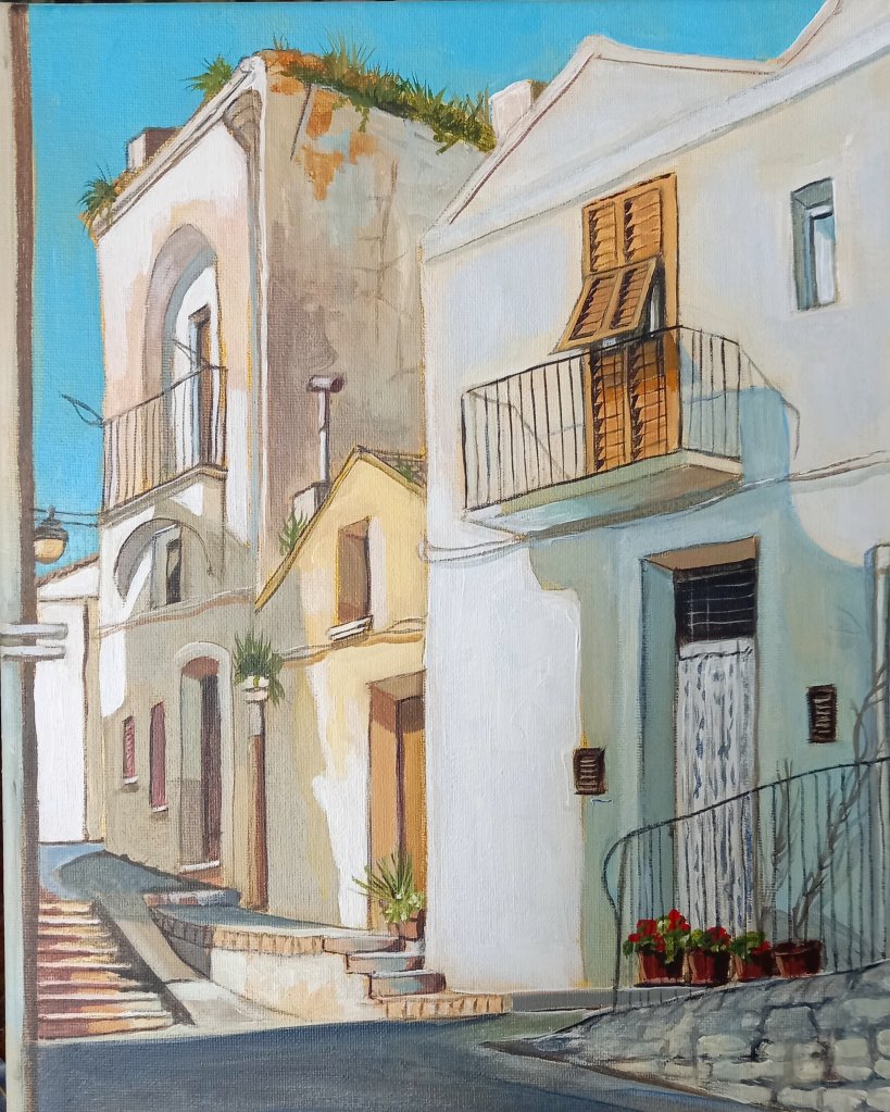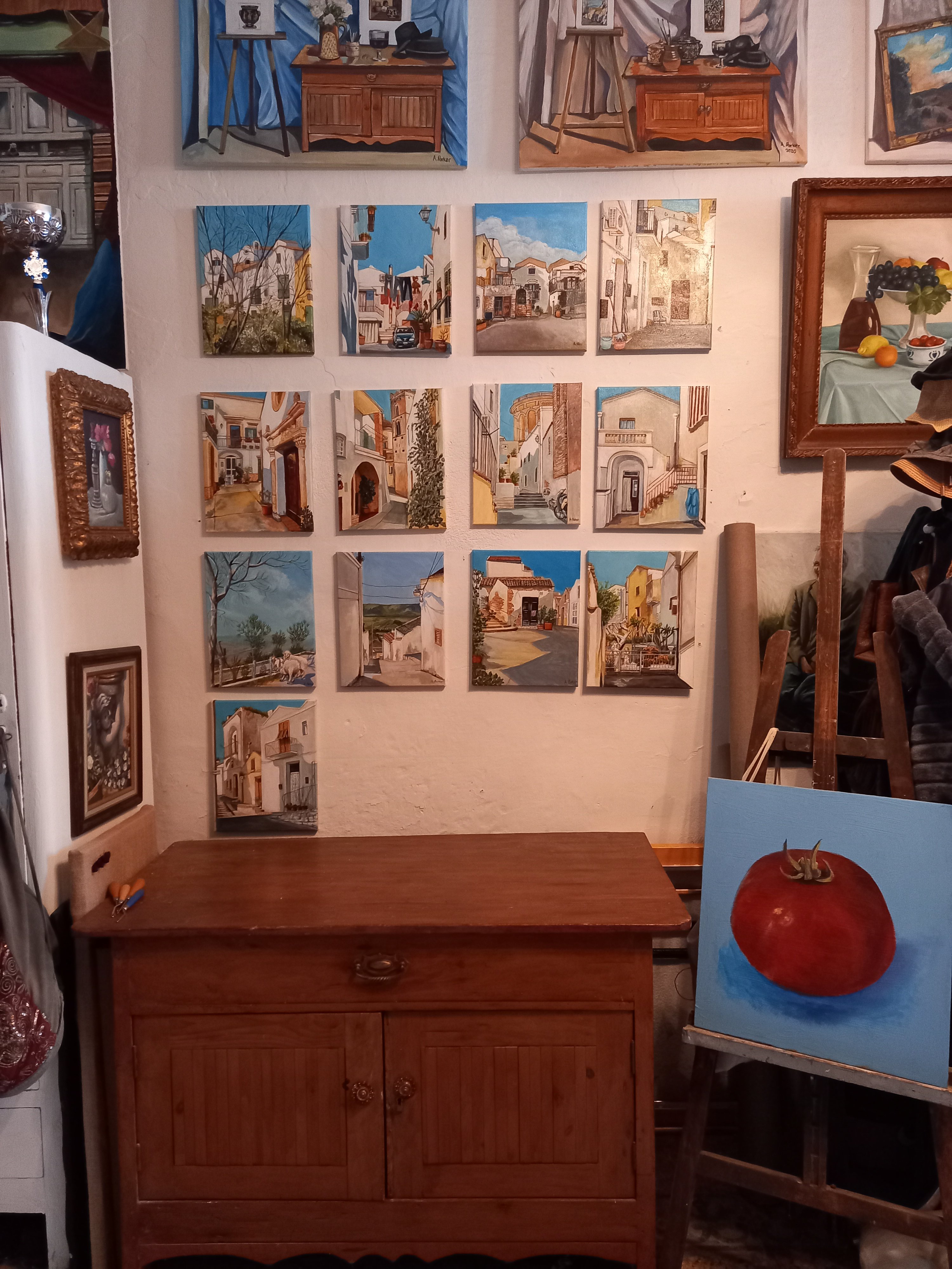 I quickly finished painting the sides of the latest small painting and then added it to the collection on the gallery wall.