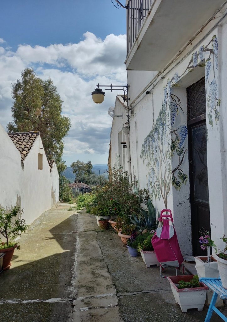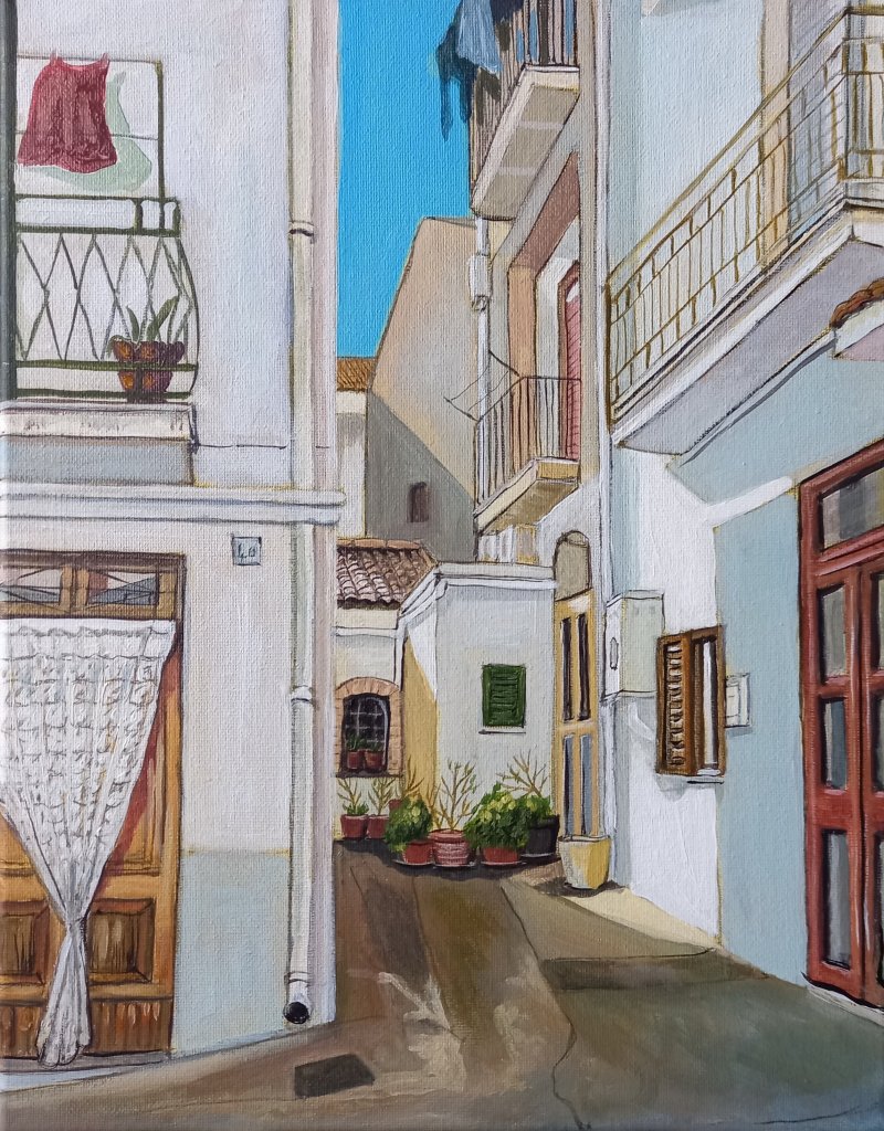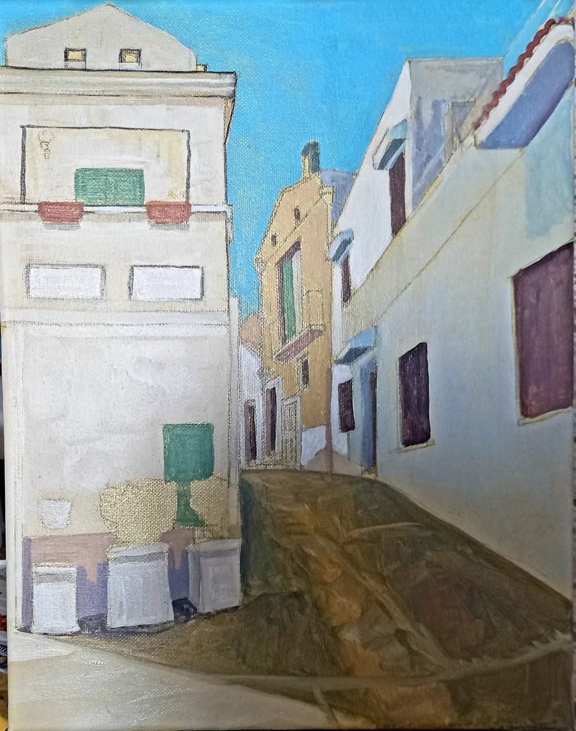 I finished yesterday’s local scene by adding a towel drying on a line and a plant in a pot on a balcony. ( I feel unreasonably guilty for adding something that wasn’t there.)