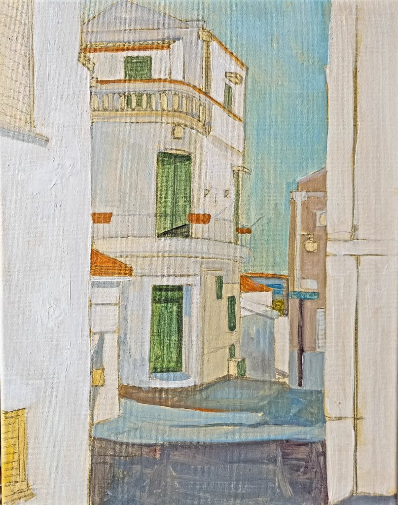 Because I was a bit careless applying acrylic medium I had to remove some dried blobs. I tried sanding them, but that didn’t work. Then I tried using a Stanley knife. That didn’t work. Then I took a Stanley blade on its own and carefully managed to slice the blobs off the canvas. ( I was very careful as I had 5 stitches in my thumb due to an accident with a Stanley knife. )