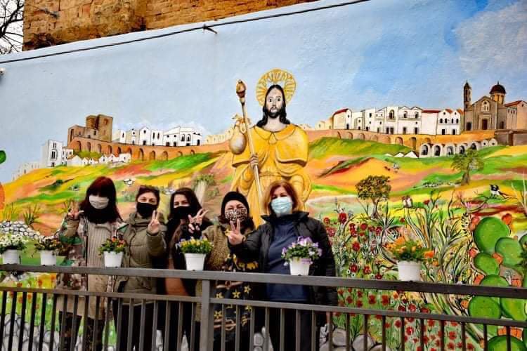 We strolled on into town and found the office ( hopefully) they were looking for and then I couldn’t resist showing them the big mural featuring San Rocco which I helped to paint.