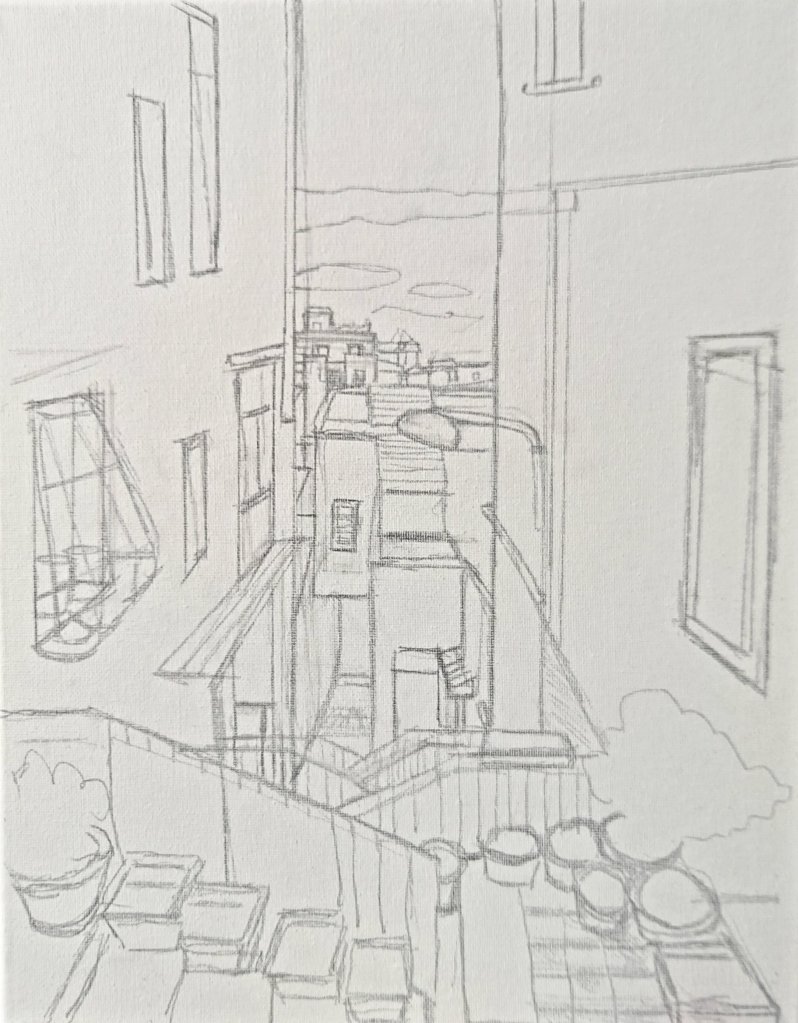 When I had a reasonable sketch I sprayed it with hairspray to set the pencil otherwise it mixes with the paint.