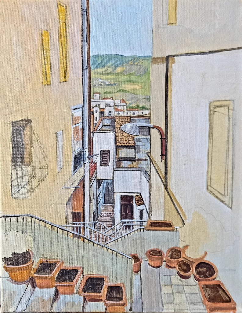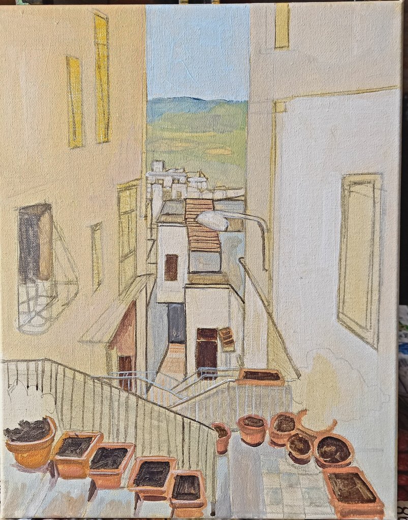 After that I covered the canvas with a yellowish watery coat of paint. That seems to work as a base. Never having been to art college or been able to understand color theory I’ve tried lots of undercoats and I like this.