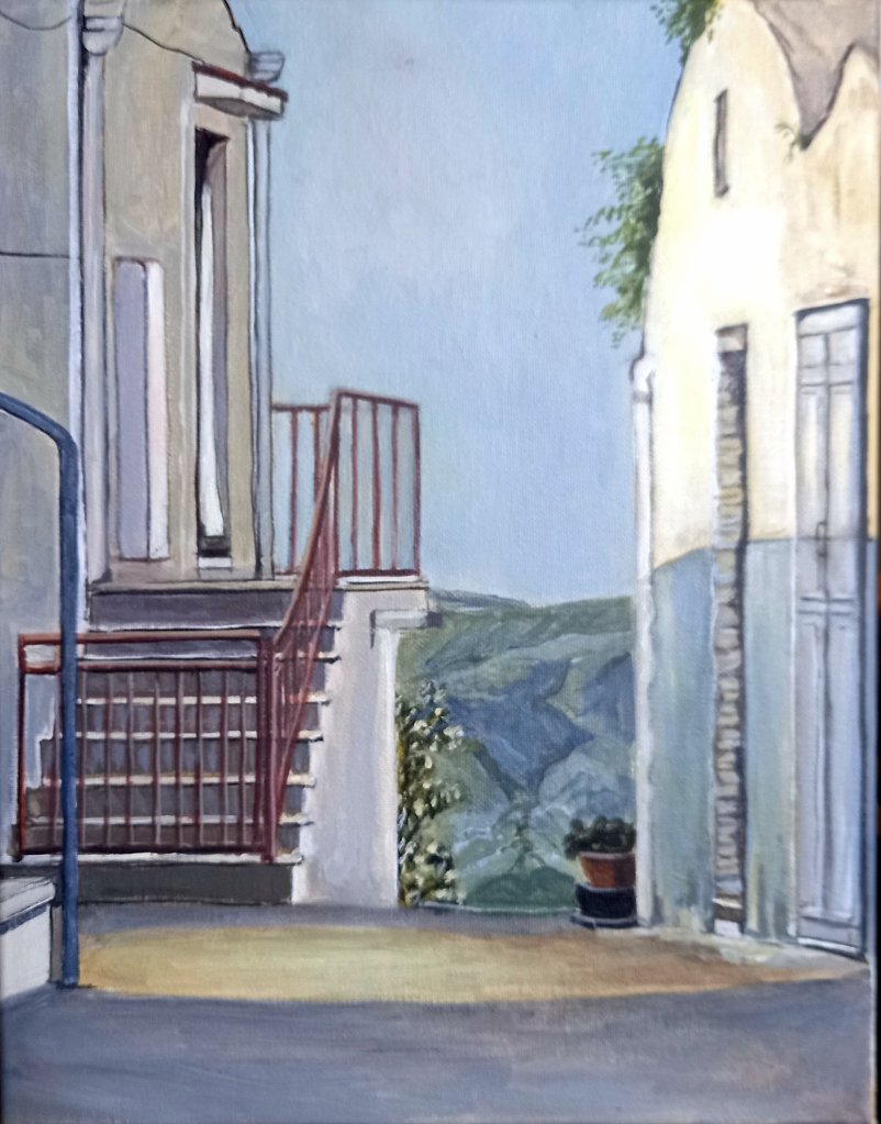 Today’s was all about colour. All the buildings are white….but not white. Getting the light on the right hand building involved around 20 layers of paint where I tried to find the right colour which also looked right with the shadow in the bottom half. Finally I found a lemony yellow which I don’t normally use and I think it’s done….at least until I look at it tomorrow and change my mind.