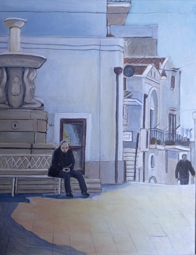 My latest painting is still a work in progress. I am experimenting with a big blue shadow and some orange.