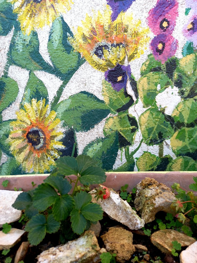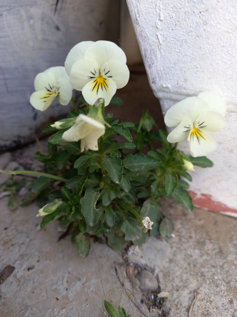 The little self seeded pansy has several flowers and seems happy growing in a crack.