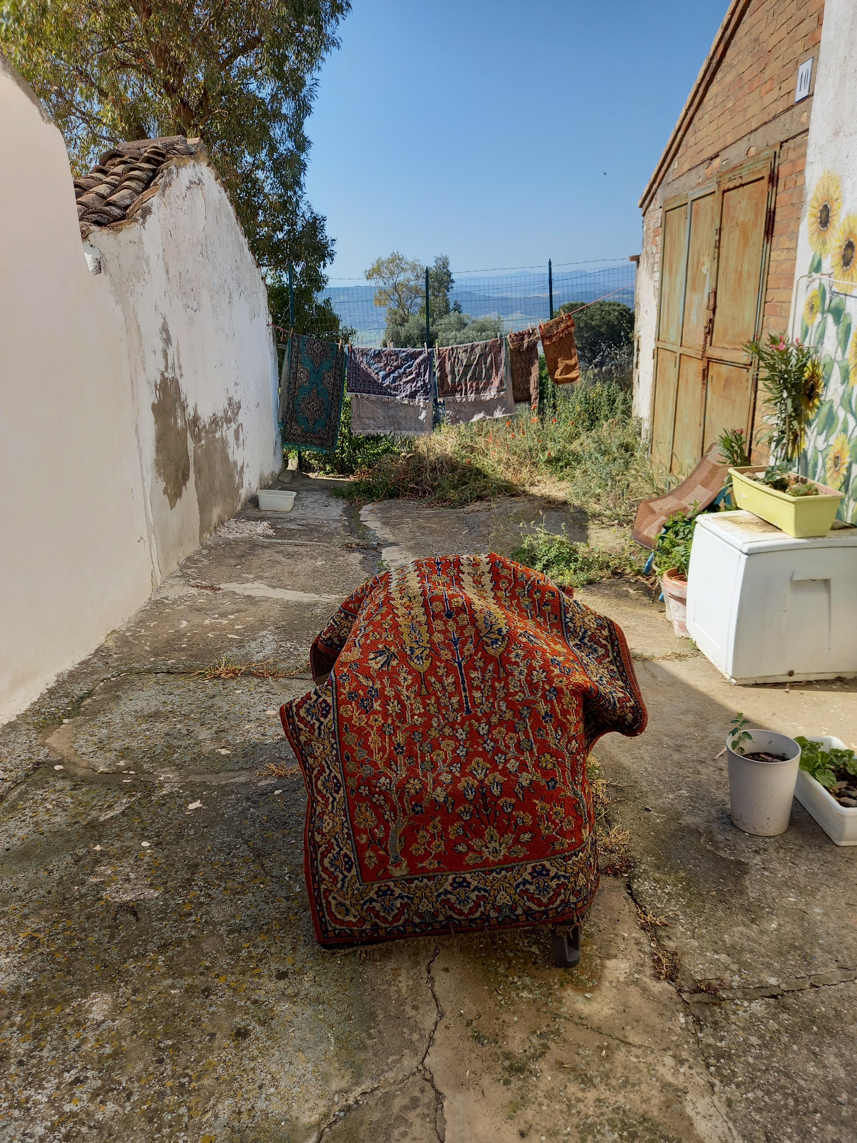 It needs to be a hot day to wash rugs so that they will dry in the sunshine.