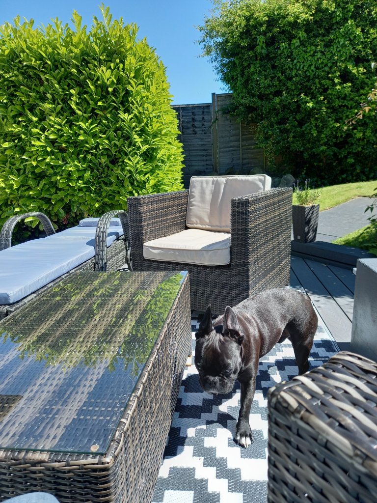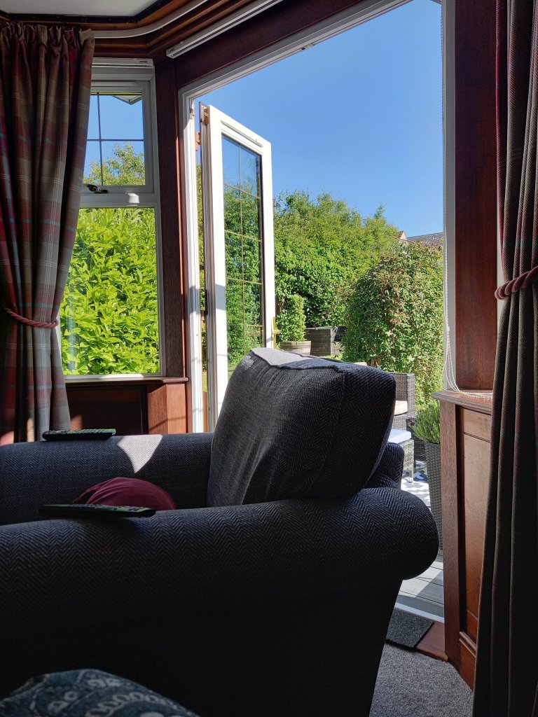 Tonight I’m sitting inside beside the wide open French doors leading onto the decked area. The sun is shining and I can hear people in gardens all around chatting and calling to each other.