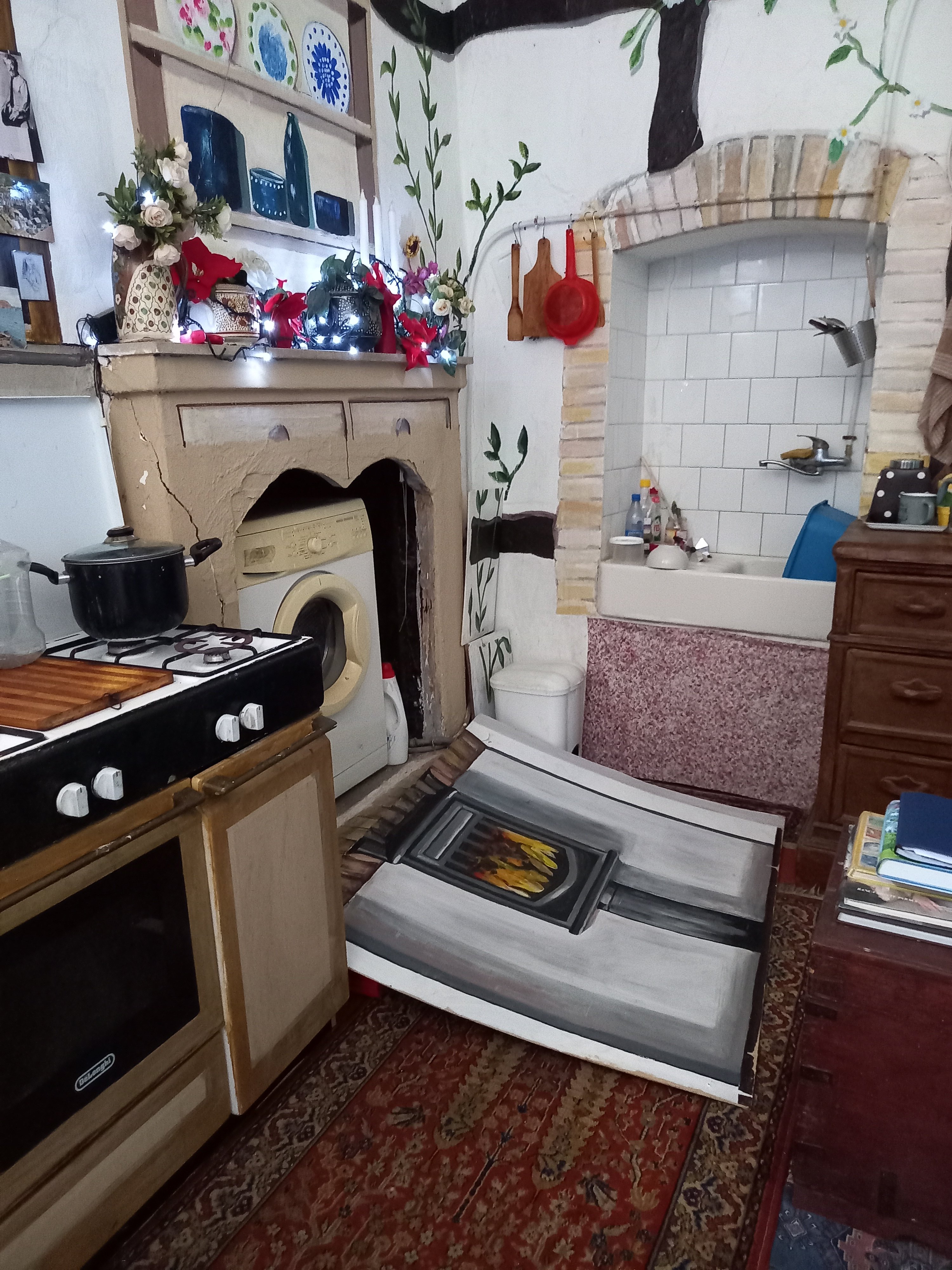 Then I opened the door and to my surprise there was a very big painting lying on the floor and then when I went through to my other room the panel hiding the washing machine was lying on the floor.