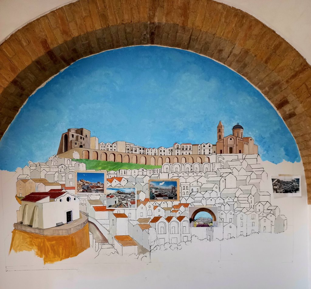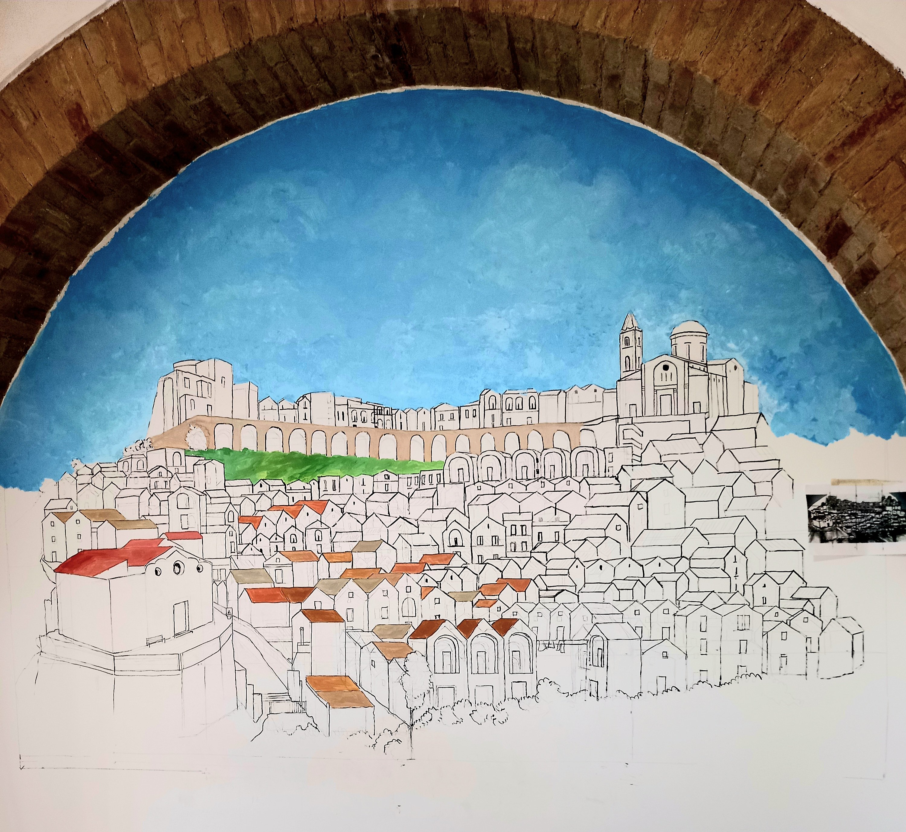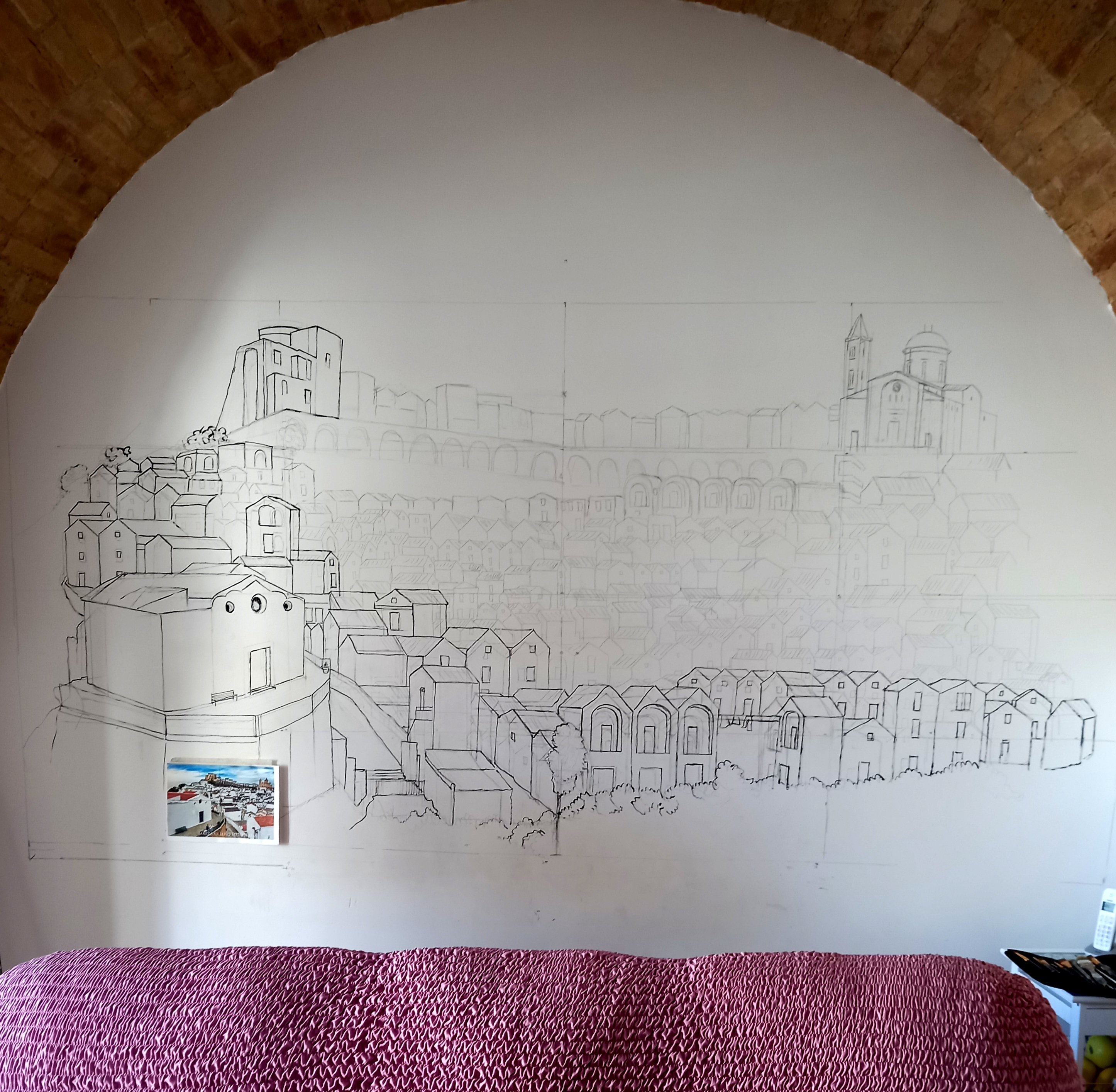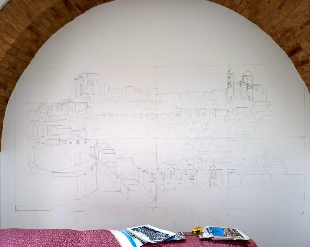 About the second day when I had measured where everything had to go and was drawing it all out in pencil.It started to look a bit better when I started drawing with black paint. I realised that I’d drawn far too many houses and made them all bigger at this point so there weren’t as many.Next I painted the sky standing on the little ladder and using a wall painting brush jammed into a curtain rail. It worked surprisingly well. I was happy to get the church and castle done. It took ages to paint the church at the front. Moving swiftly on, I thought I’d better see how the bottom part would look.Some of the details from today. I like painting washing hanging out. (And there is a little procession above the arches.) And finished.