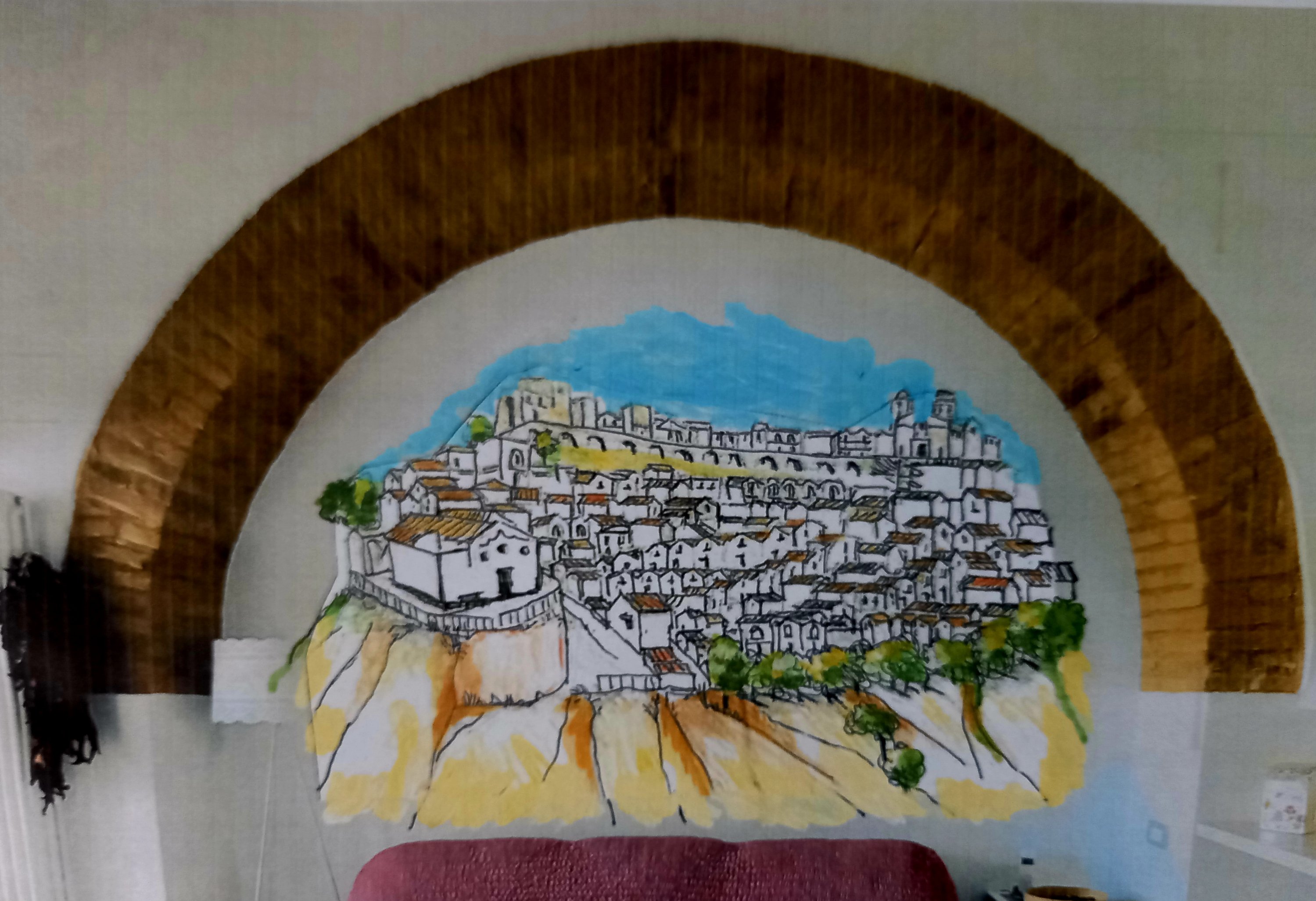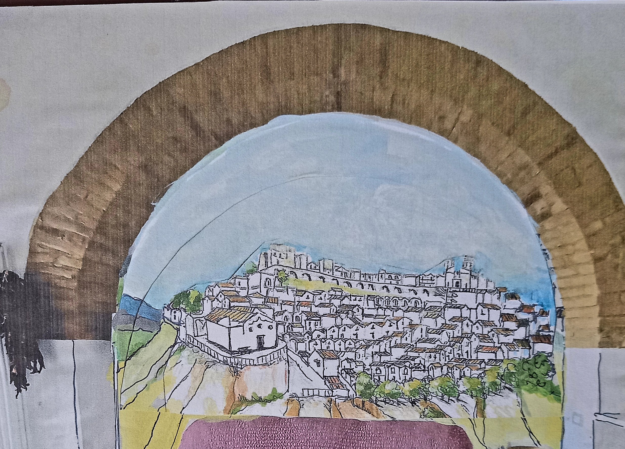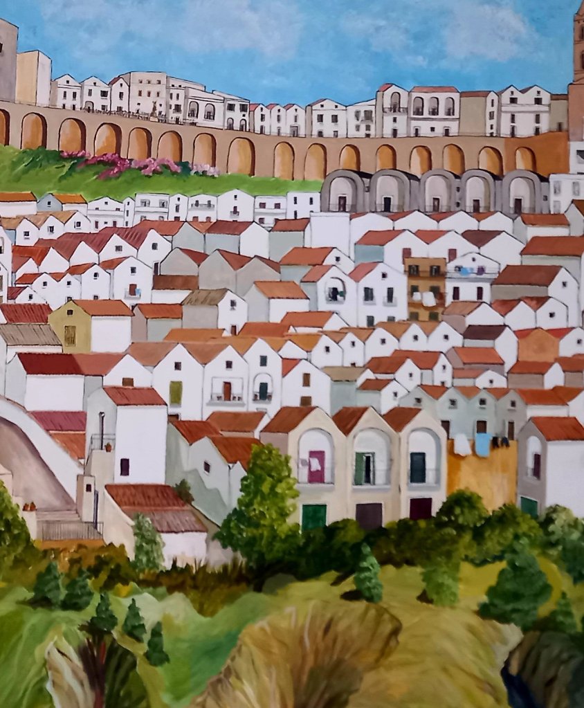 About the second day when I had measured where everything had to go and was drawing it all out in pencil.It started to look a bit better when I started drawing with black paint. I realised that I’d drawn far too many houses and made them all bigger at this point so there weren’t as many.Next I painted the sky standing on the little ladder and using a wall painting brush jammed into a curtain rail. It worked surprisingly well. I was happy to get the church and castle done. It took ages to paint the church at the front. Moving swiftly on, I thought I’d better see how the bottom part would look.Some of the details from today. I like painting washing hanging out. (And there is a little procession above the arches.) And finished.