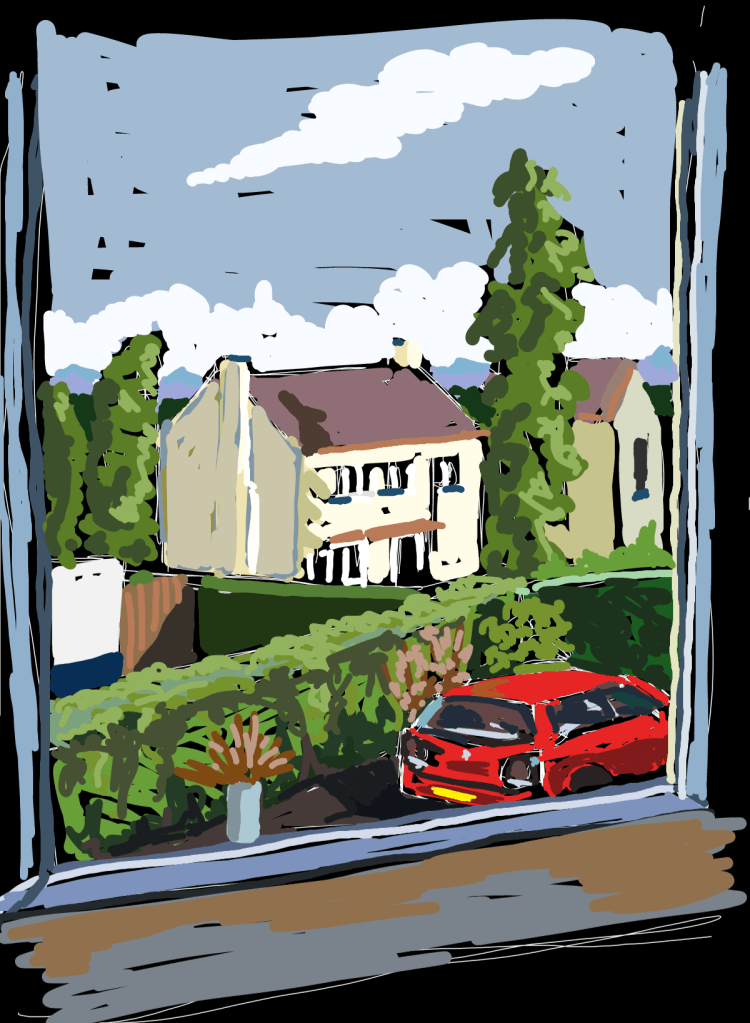 Today I was a bit tired and my foot hurt. So I sat down at the table , moved some birthday cards from the window ledge and painted the view.