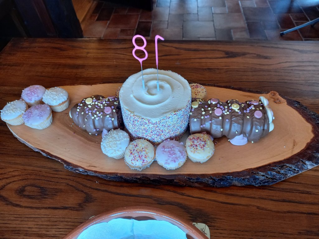 The cake was a somewhat unusual combination of a chocolate caterpillar cake and a rainbow cake, with a few cupcakes for added effect.