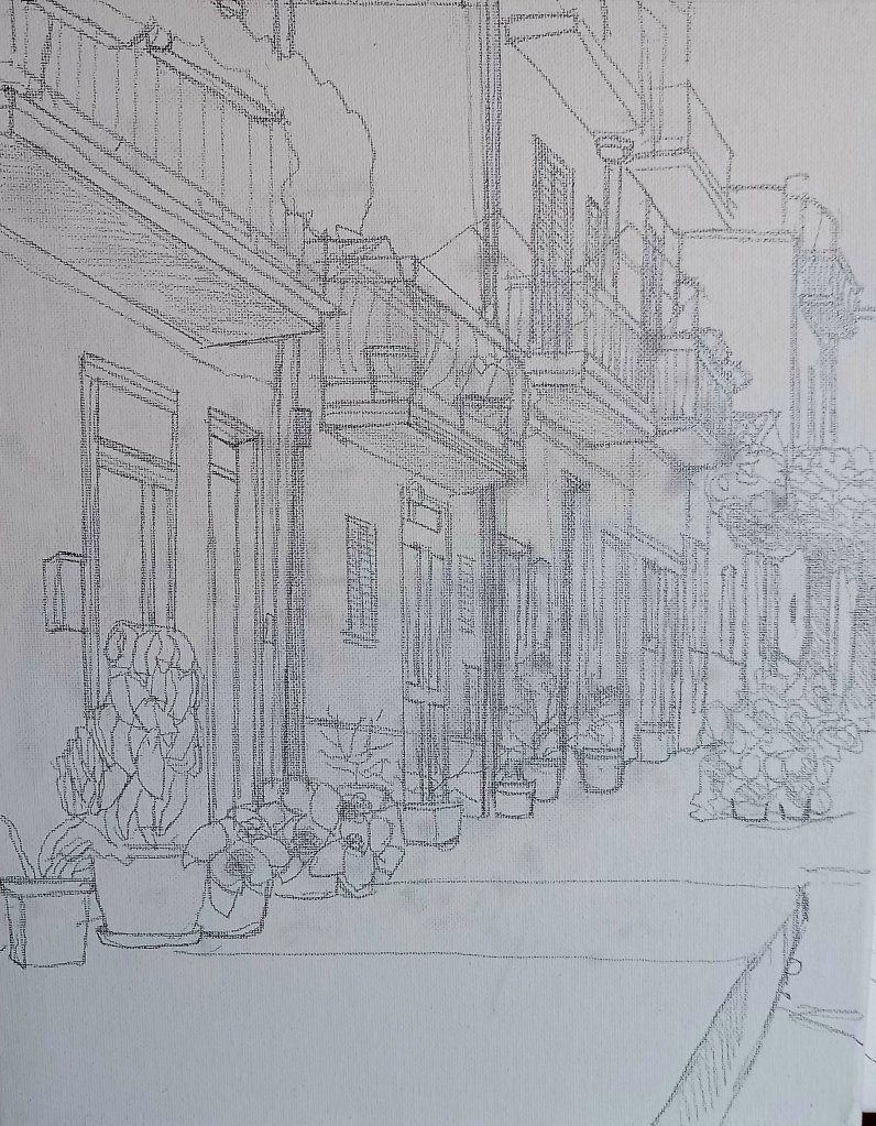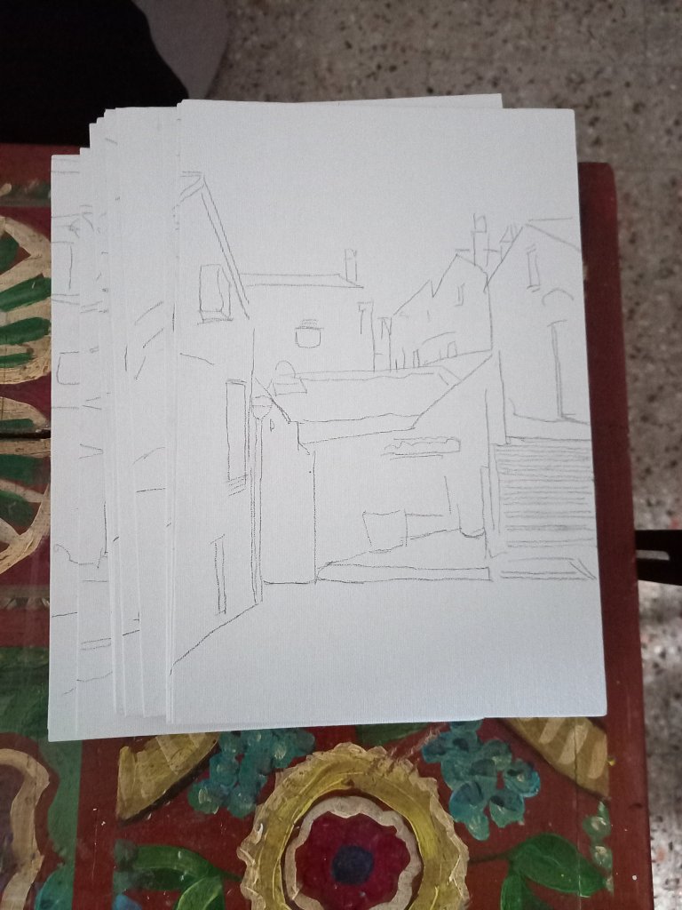 My 14 canvas boards ( called stretched canvases??!!!) arrived with the postman after lunch and I’ve now very roughly drawn 14 small local scenes. The last few were more roughly drawn than the first few.