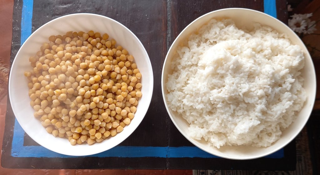 It’s a satisfying feeling to have 16 little bags of cooked rice and 4 bags of chickpeas in the freezer. That’s the base for 32 meals. I’m not very fond of cooking so getting it all over with in a morning suits me. I made peanut butter too.