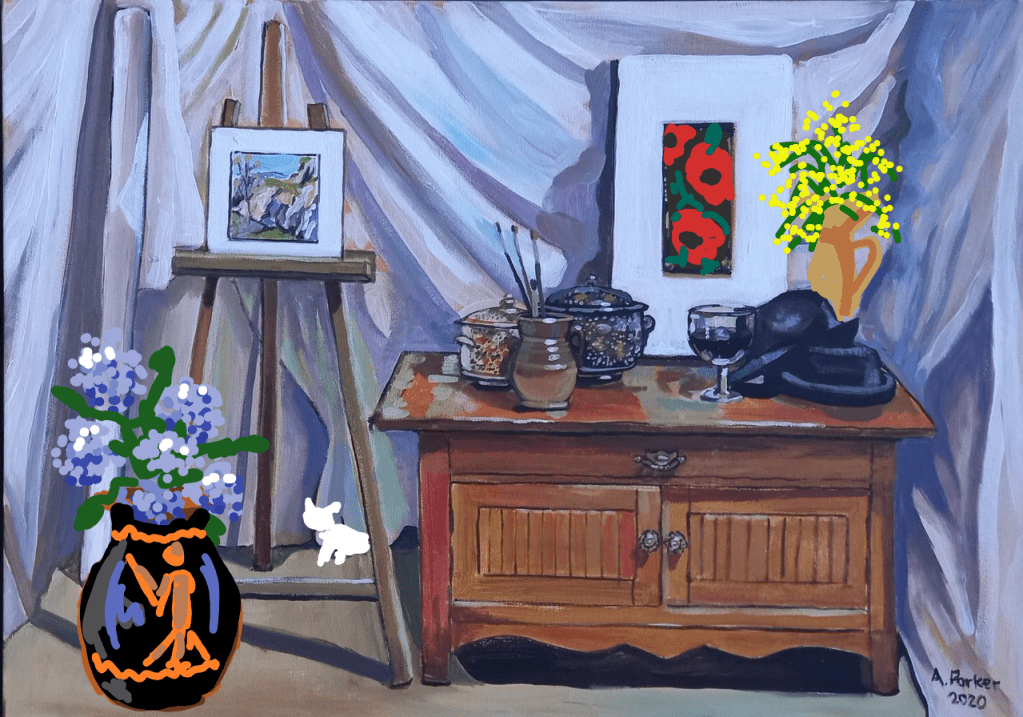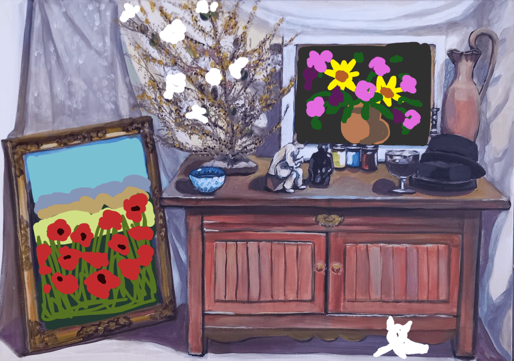 I downloaded photos of the paintings I want to cheer up, and hopefully sell, on to PAINTART. This might not be what the final paintings will look like , but I definitely plan to include Fluffy.