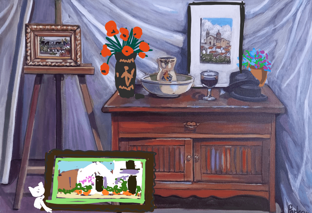 The originals were all painted from life two or three years ago . The chest is an antique and all the objects have some meaning for me.