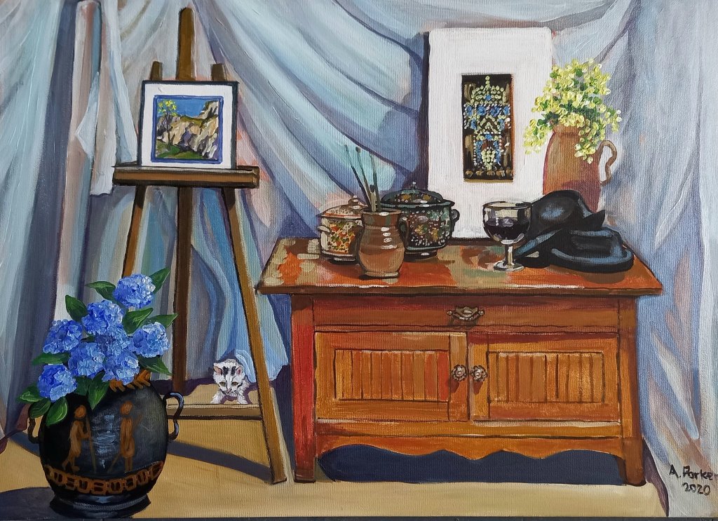 I worked on it off and on all day. As usual it took much longer than I thought it would and I changed a lot of things as well as adding to it. Fluffy was the last thing to be painted.