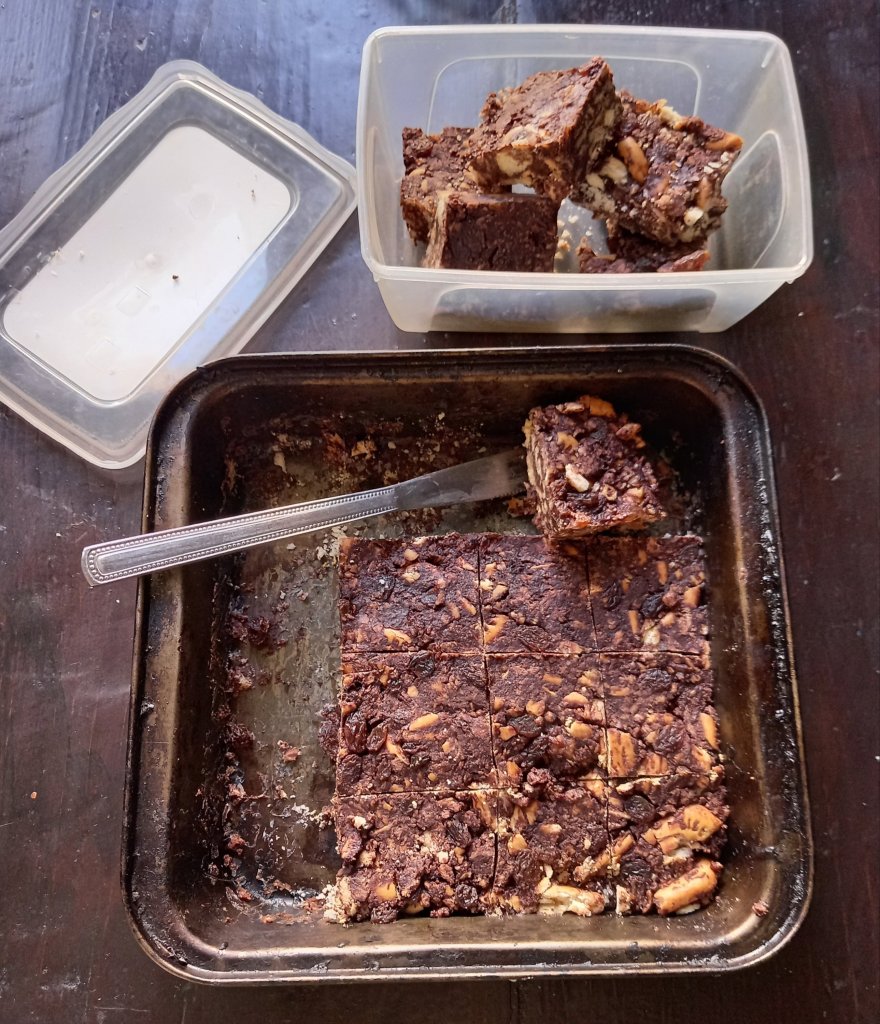Then after finding a recipe online in the middle of the night I made a chocolate and crushed up biscuits tray bake ( no baking required) . It’s part of my plan to be more sociable and have something interesting to offer guests. It was made almost entirely from leftovers or things I wouldn’t otherwise use.