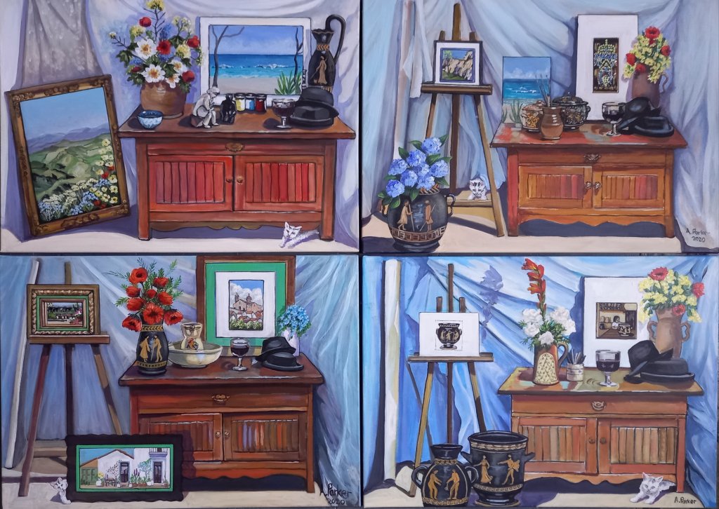I didn’t stop work until nearly 5pm , but I have ” cheered up” 4 big still lives. They were originally painted from life , but all the additions have either been made up or from reference photos. I’m pleased that I’ve finished and that they definitely look cheerful. I’m also glad that there is a little white cat in every one.
