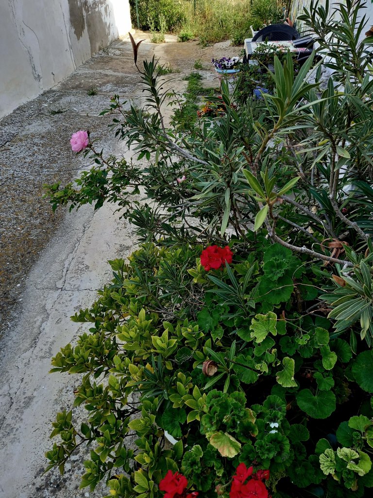 I went out to see if any more roses had opened . There are several nearly there, but only one blooming. I tried to take a photo of all my flowers while holding back an oleander branch. Tricky!