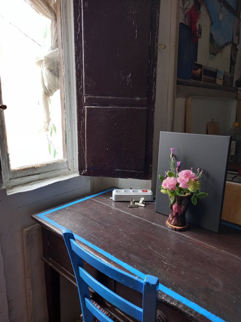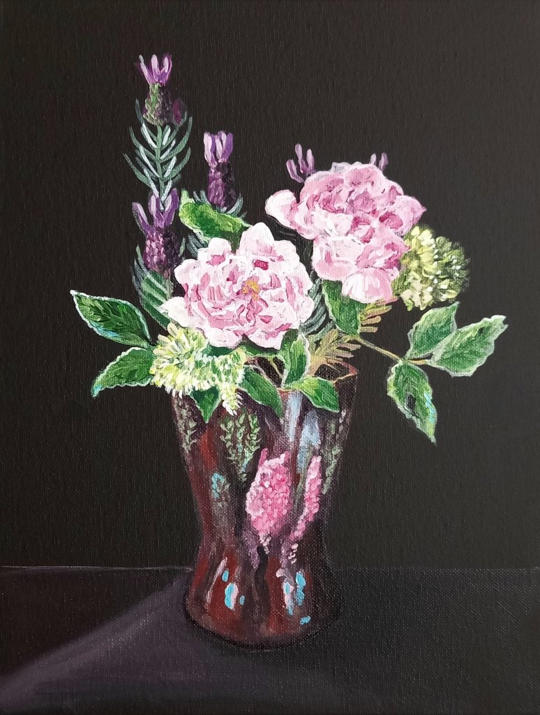 The day began with grey skies and a forecast for rain so I picked 2 of my roses , some lavender and two other strange green things my neighbour gave me and set them up as a still life.