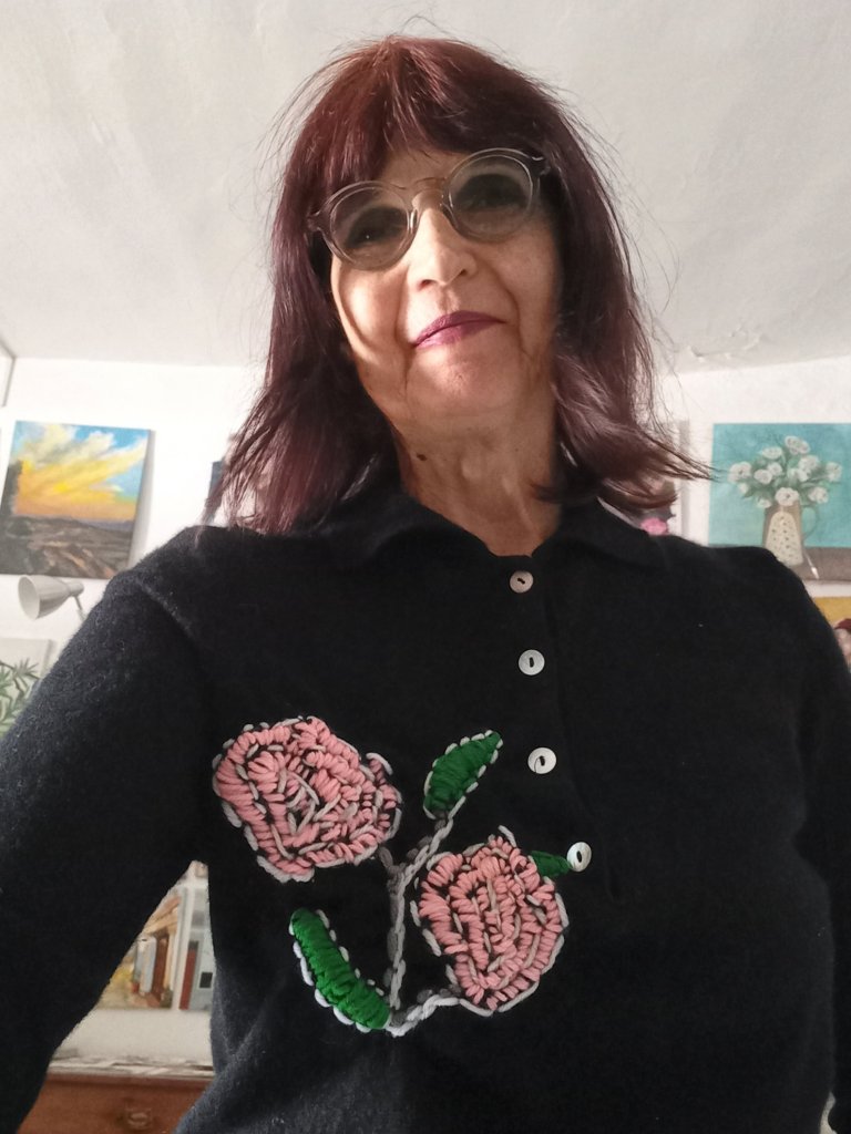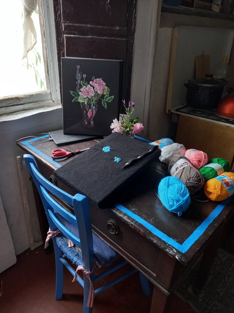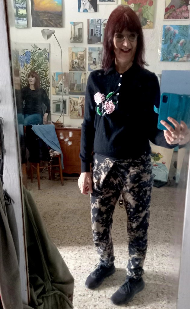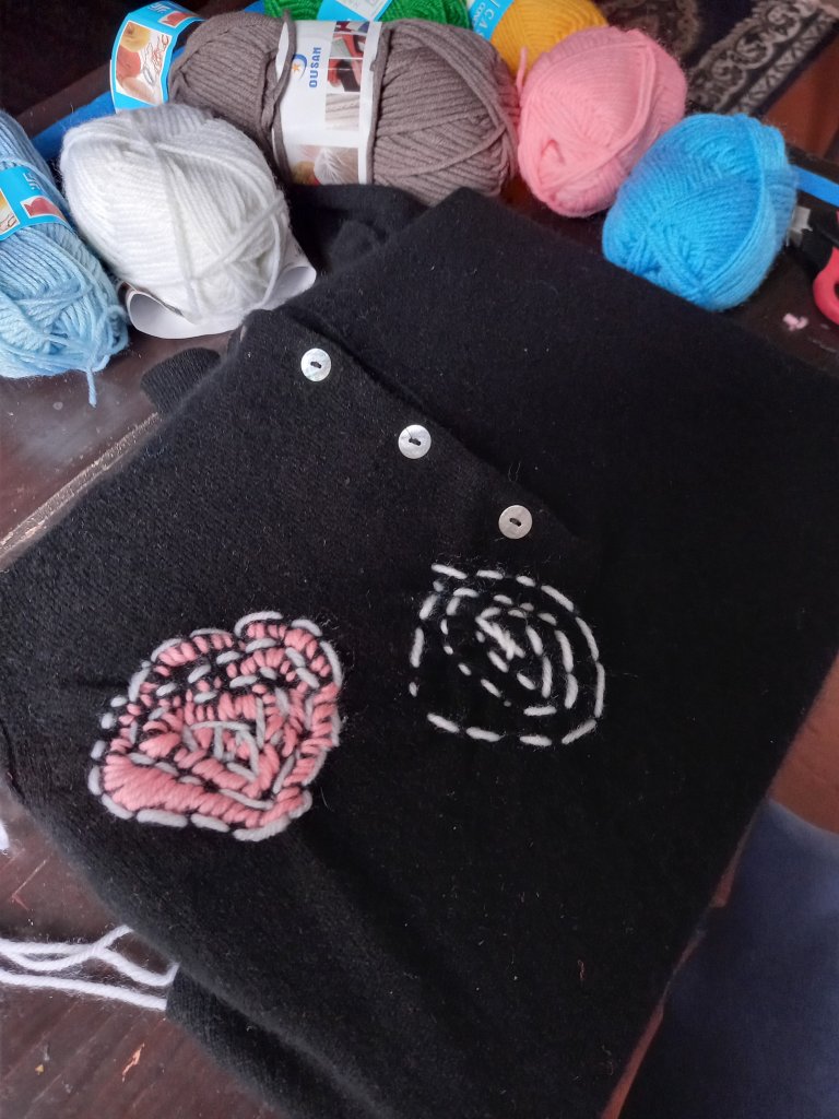 I was thinking of the emperor’s new clothes analogy here as I am not convinced that my woollen roses don’t look like a mess. But on the other hand , if I stride confidently about then perhaps anyone noticing might think that it is a new fashion/ abstract/ modern art and not that someone has inexpertly sewed some rough roses and leaves on a €2 cashmere jumper to hide a few marks.