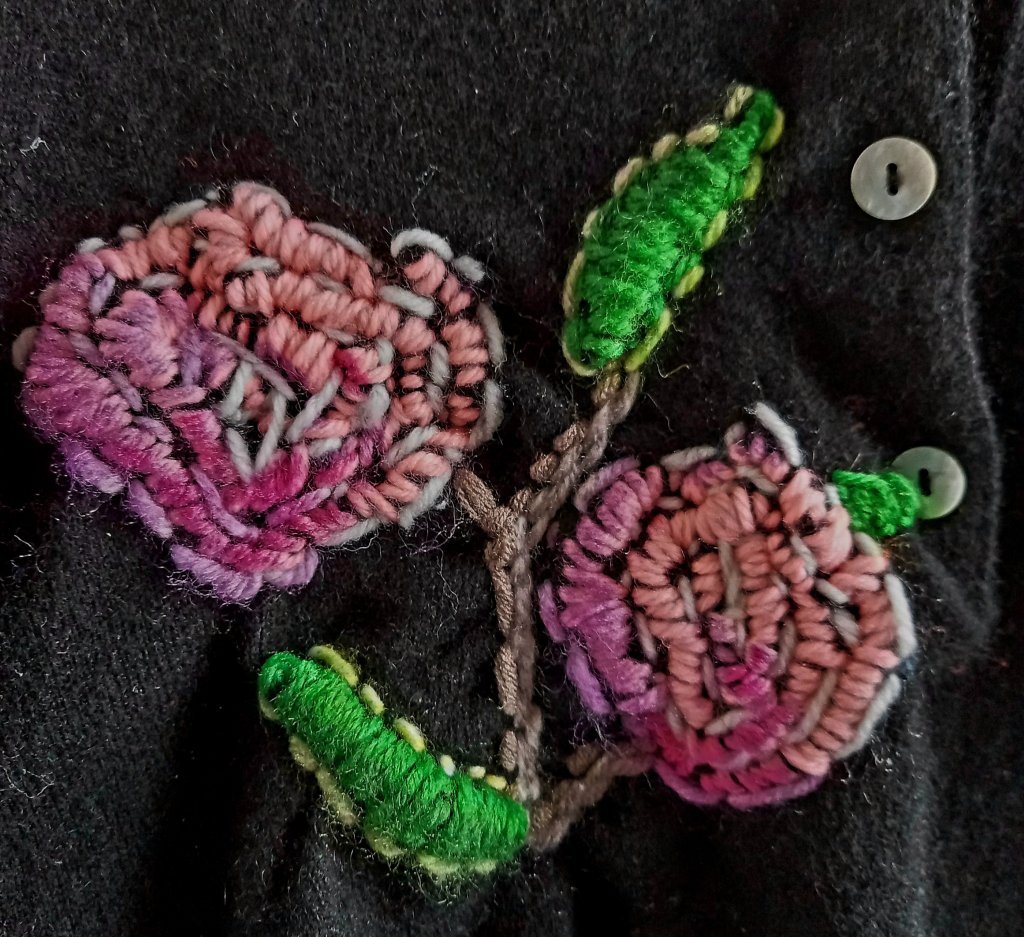 After breakfast I wondered about improving my “sort of” embroidery on my jumper. So I got out my new crayons and ” painted ” some wool. It seemed to work.