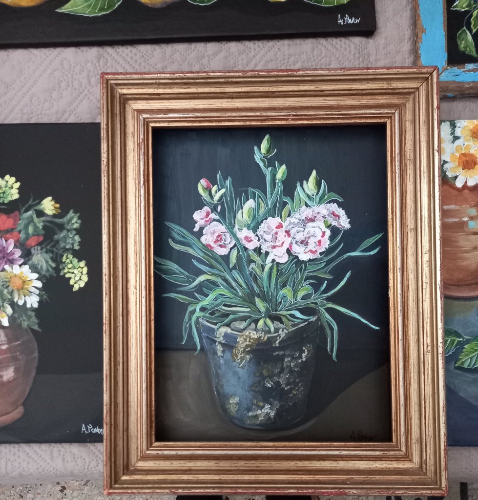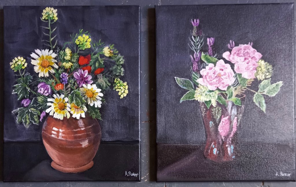 Having done that I thought that maybe 2 of my flower paintings would look better with a different background. I used a coloured glaze.