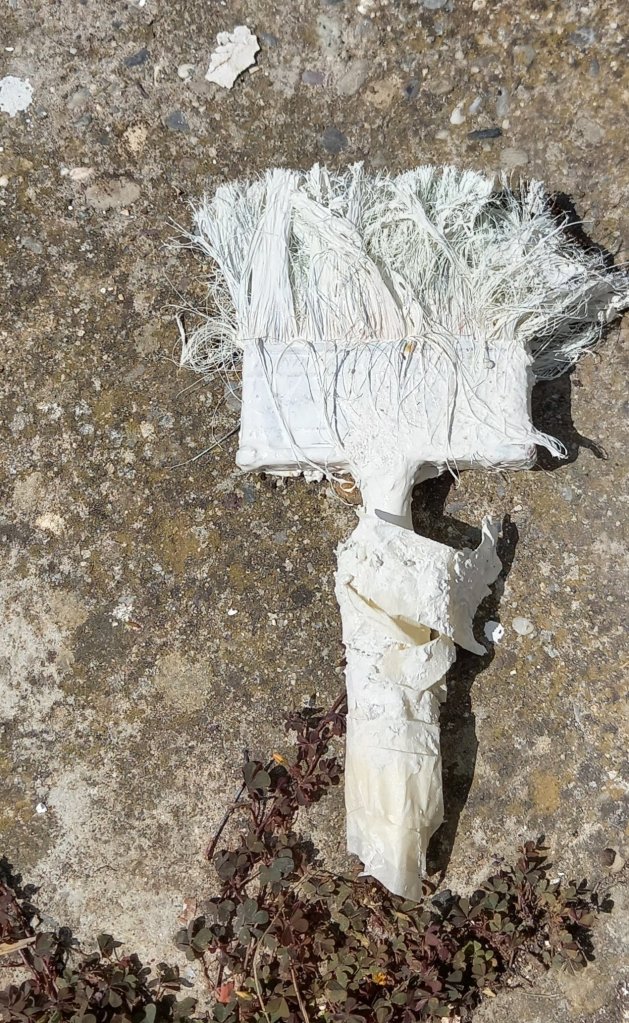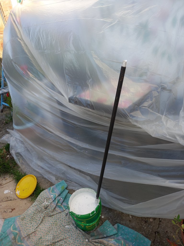 So armed with my homemade brush taped to curtain pole , the pot of white paint and a large plastic cover I bravely stepped out into the street.