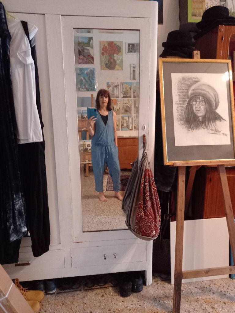 While waiting for paint to dry I found another pair of dungarees, cut the sleeves off them, (have a plan for using the sleeves.) then hemmed the armholes and was reasonably pleased with the result.