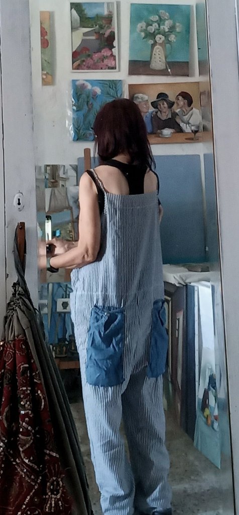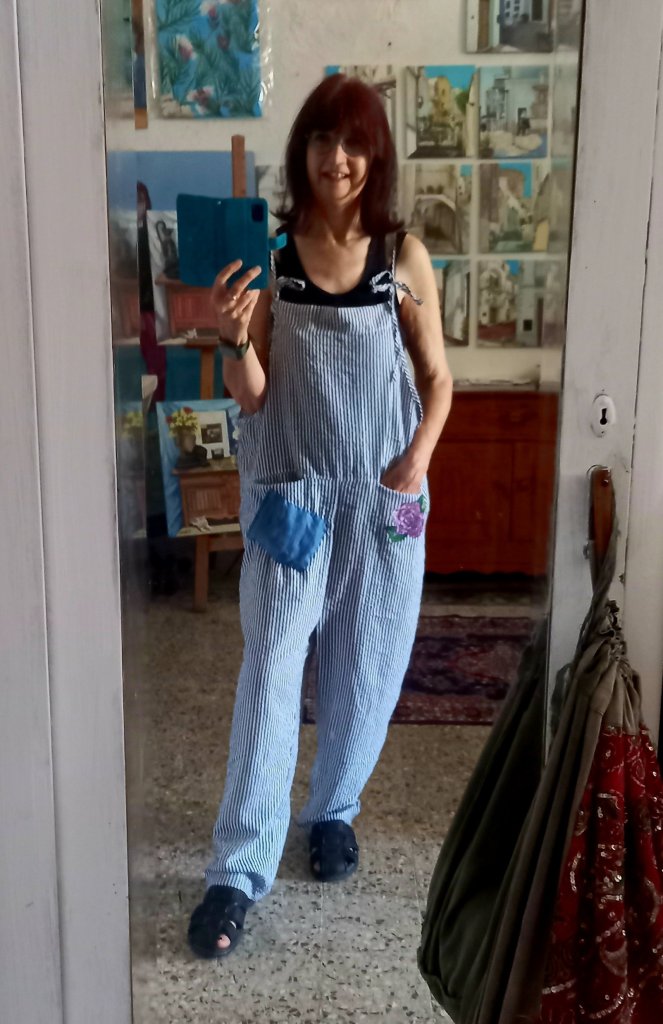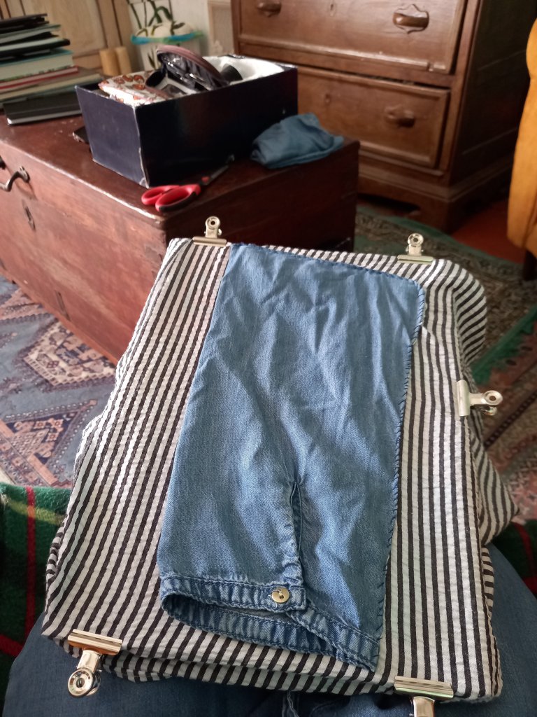 However, the further work on my stripey dungarees went well. The sleeves made very satisfactory pockets. May have to upgrade these to ” evening in the house wear”.