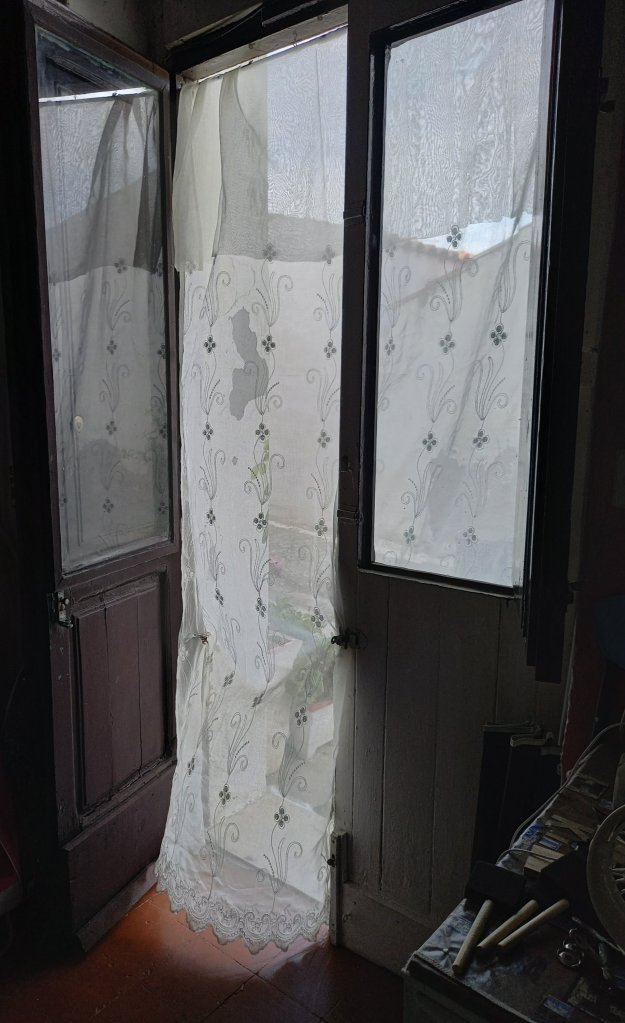 It’s been windy all day so I thought that I’d like to have my other door open to let the air in. That required a bit of fiddling around with some wire and a curtain pole and then finding a curtain . I had to cut it to fit. It’s not a very good job, but it works so far.