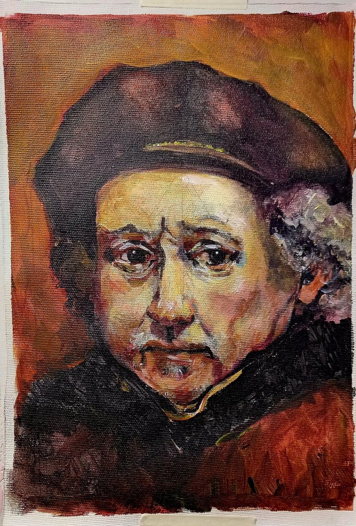 I’ve started 2 pencil sketches for next week, but after that I gave up until about 4pm when I decided to finish the painting of rembrandt that I had been using in the last art lesson.