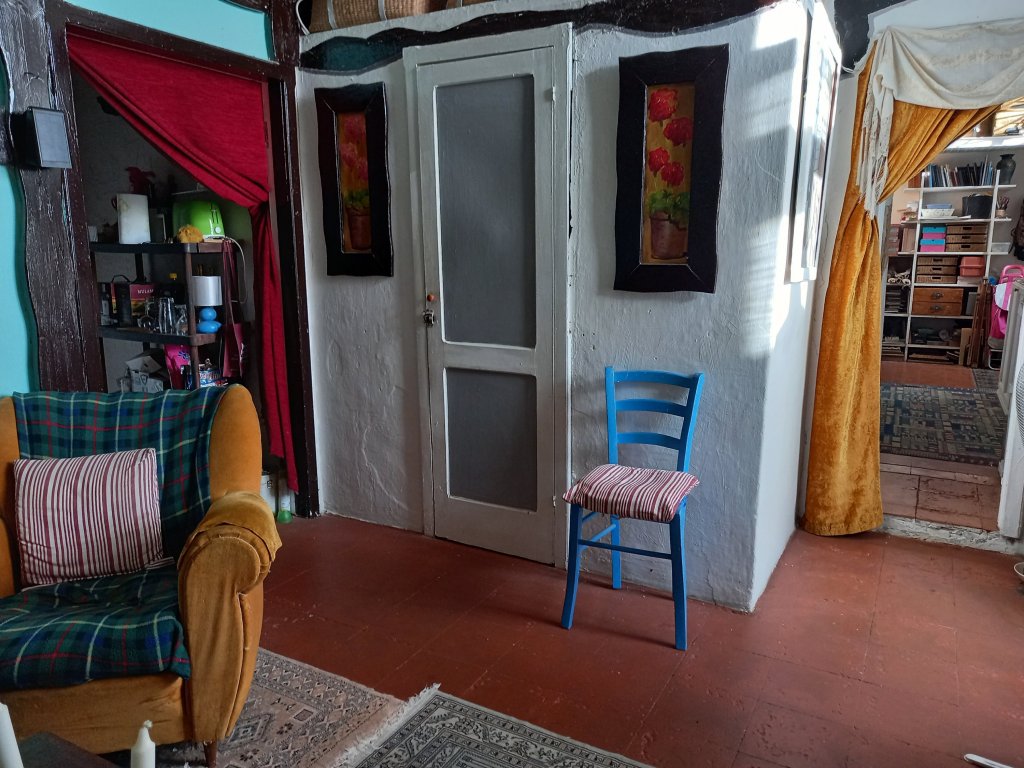 This summer I’ve upgraded my house with paint . First there was the floor in the workroom which is now terracotta like the living room. Then there was the sink alcove which is also terracotta surrounded by bricks. Then there was the blue work table. And now the brick wall. There are also a lemon and orange tree in pots by my door.