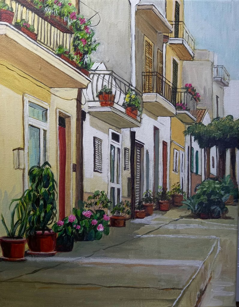 This afternoon I worked on yesterday’s painting with all the windows,shutters, doors and balconies etc.
