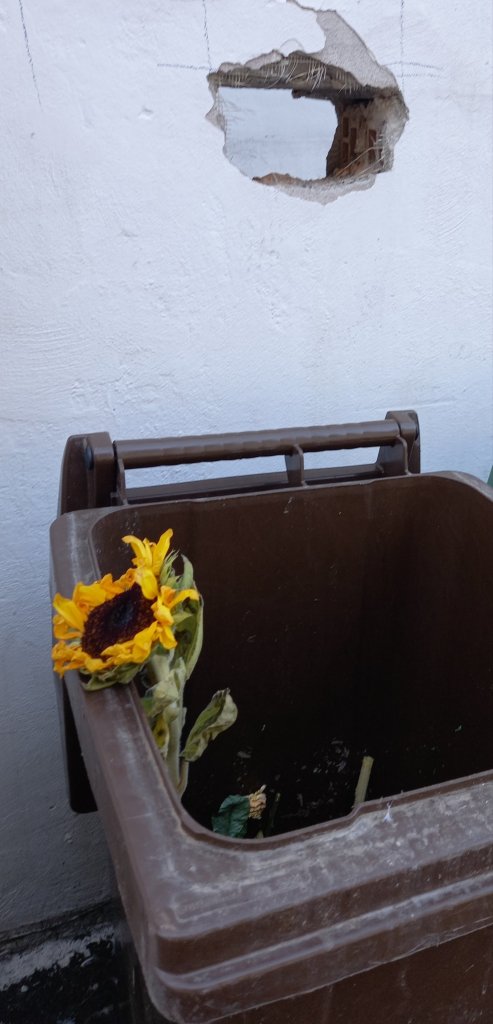 That was when I saw the sunflower hanging out of the bin. Something about it caught my attention. So when nobody was looking I went back and took a photo.
