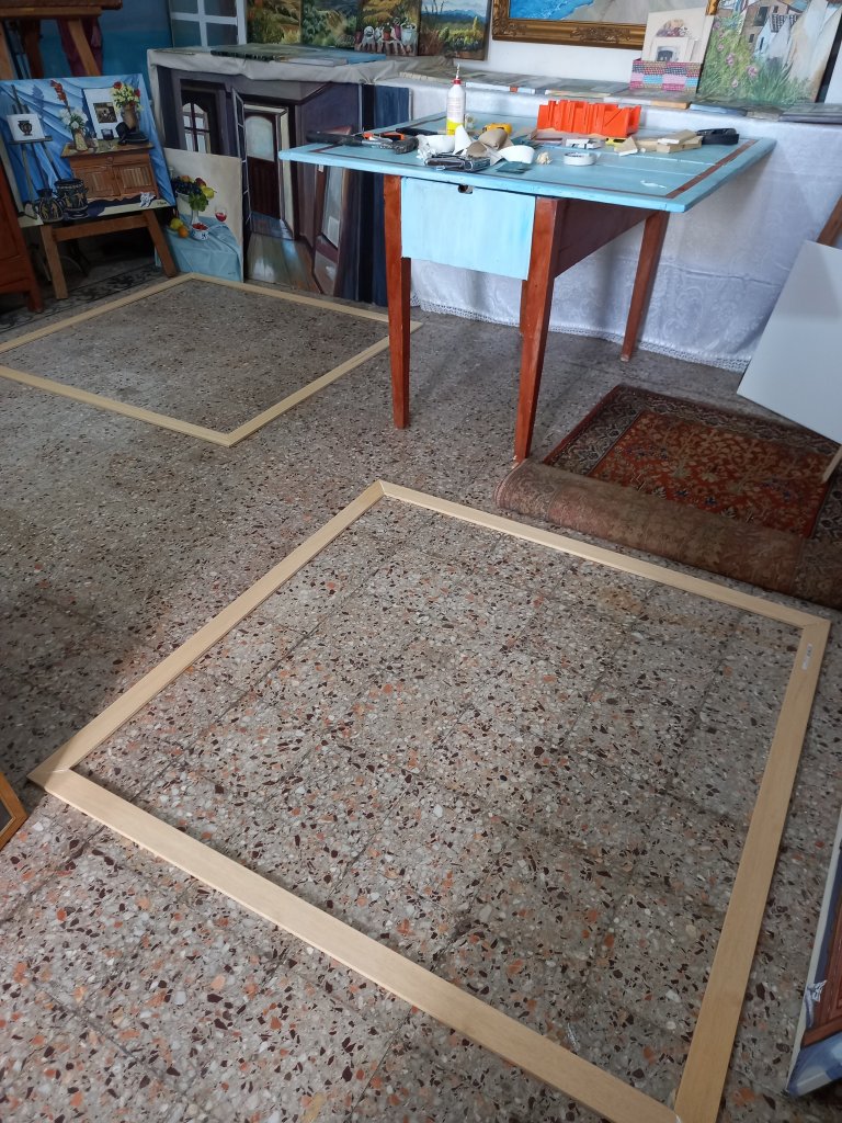 As my wood was two and a half metres long I decided to make square stretchers 120x 120cms and then there would be very little waste. ( some artistic decisions are just practical. ) I couldn’t believe that I got every one just right. ( 12 cuts with a saw.) I don’t much like sawing. Glued and stapled and left for glue to dry. Cutting off the odd bit of canvas. Will make stretchers to fit that another day. One done, one to go. A whole bunch of small practice pieces.