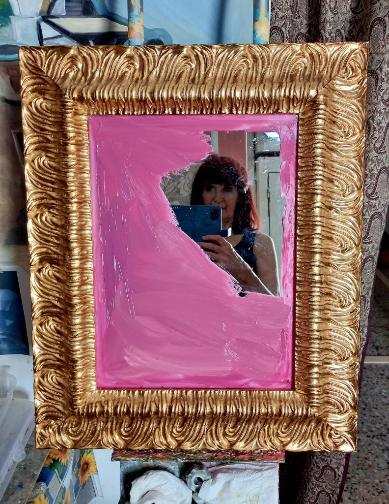 And in the meantime while I was waiting , and because my jumper fell down the side of the cupboard, I found a framed, decorated mirror and decided to make it paintable. Being very cautious with a Stanley knife ( having had 5 stitches my thumb previously is apt to remind me to be careful), I scraped all the decoration off and painted the mirror.
