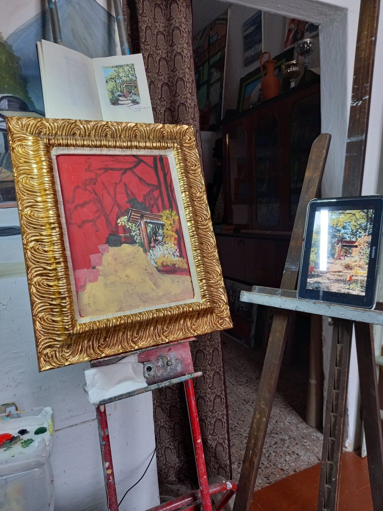 It seemed like a good idea to paint myself in the little wooden shelter first and if that went well the rest of the painting would go better.