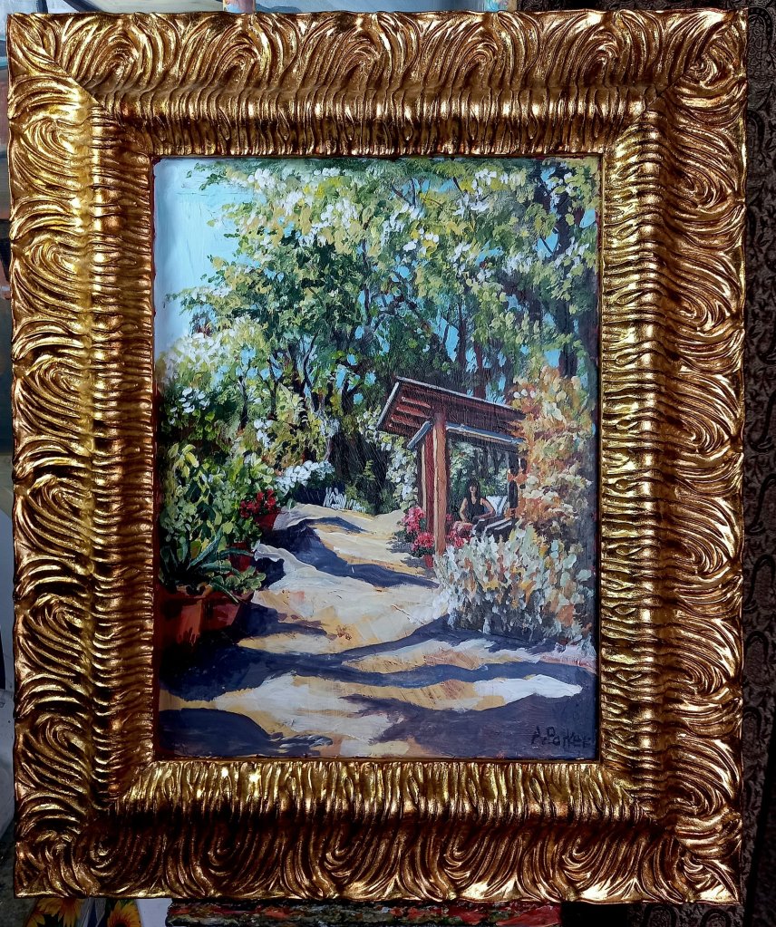 I thought that I’d like to paint something on the mirror in a gold frame that I’d prepared earlier.