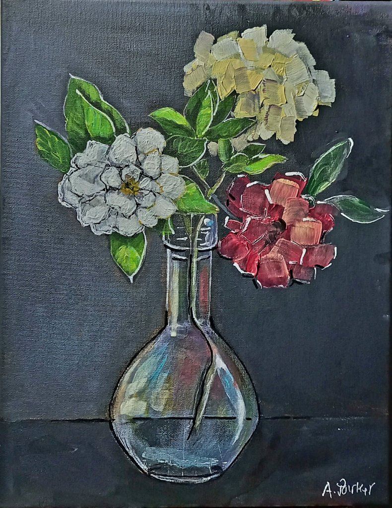I’m also waiting for a little inspiration, but I helped that along by adjusting a painting to pass the time. I want a set of four flower paintings on dark backgrounds and the fourth one had a blue and brown background. Now it doesn’t…..and it has some extra leaves and 2 more flowers.