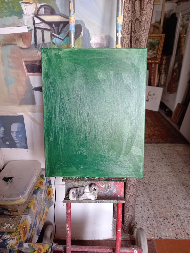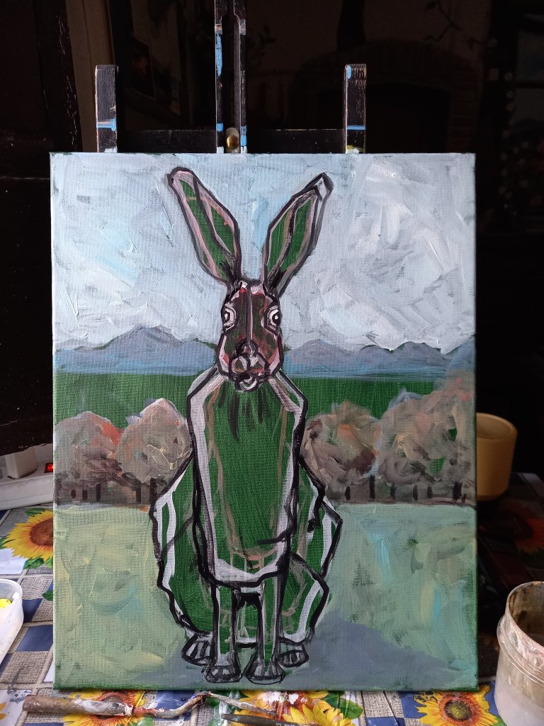 However , just for fun, I started work on the giant hare on a green canvas. It is exciting painting something just for myself.