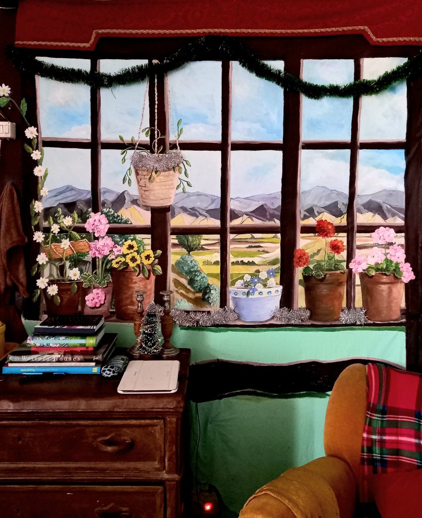 I thought it would be funny to make it look like tinsel was spread along behind the flowerpots on my fake window ledge.