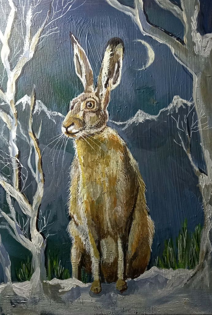 I used a photo of a hare from Pinterest and then invented the background. I am particularly pleased with the moon.