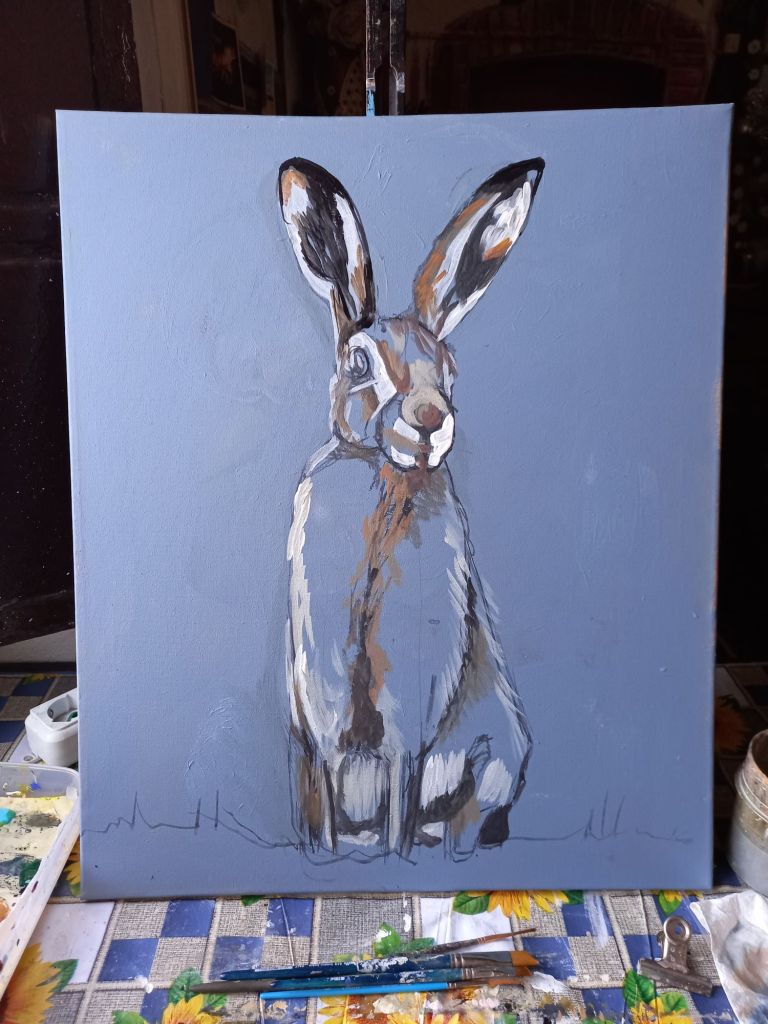 I decided to paint another hare .Because I can…..and it’s fun. This is based on my dream where a giant hare was sitting looking at me.