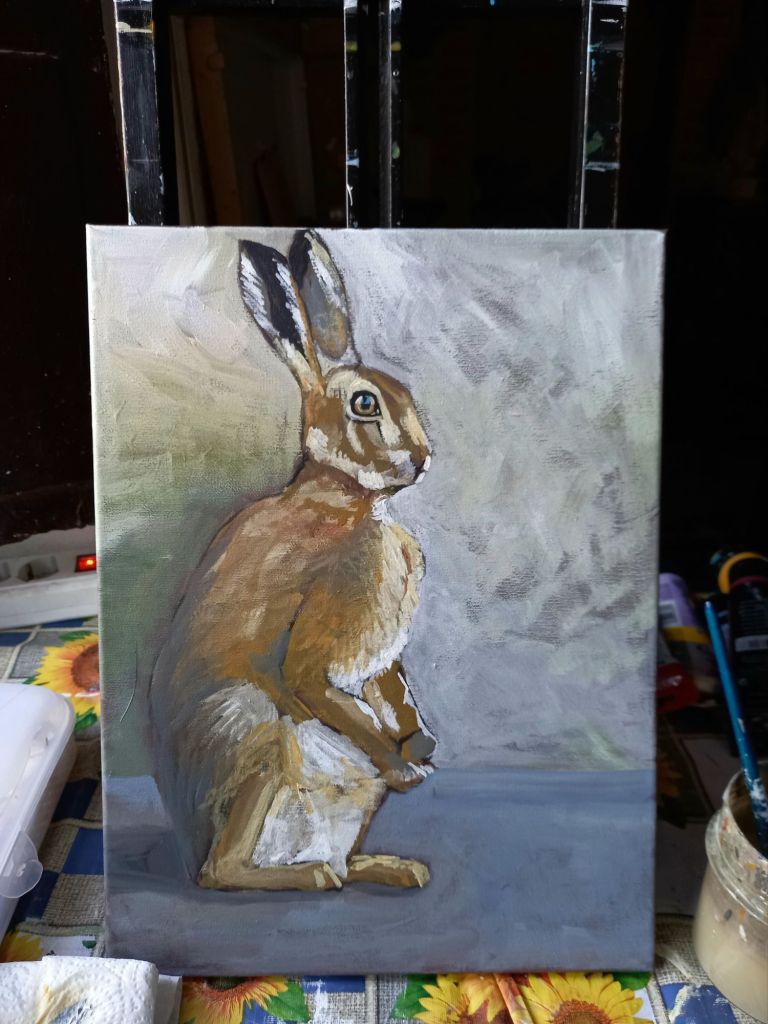 I’m on my 5th hare painting and I haven’t any more used canvases to paint another one.