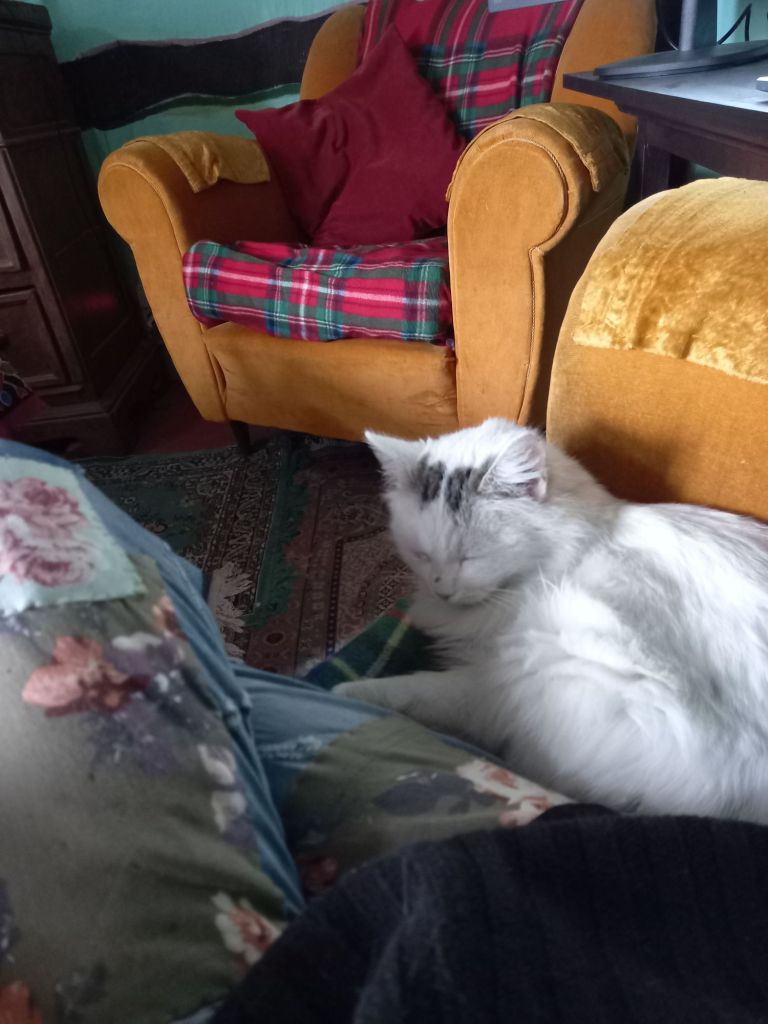 Fluffy was very cuddly today and slept on my knee for about an hour. She has 2 scrapes on her face and it looks like her ear has been bleeding.