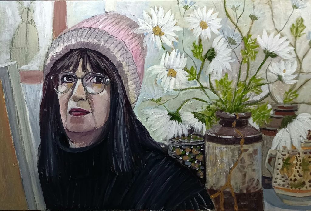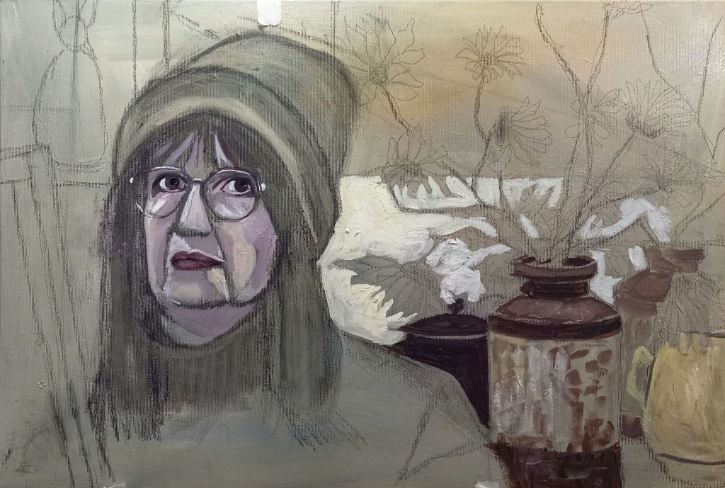 I was going to make the background a bit vague, but I got carried away. I even used gold paint on the vase. It was fun…..unlike trying to paint myself. It doesn’t help that I can’t see myself , or at least my eyes, very well. Though that might just be an excuse ……..