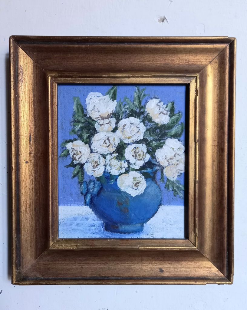 This afternoon I repaired a frame and painted another small vase with white roses on a canvas board .