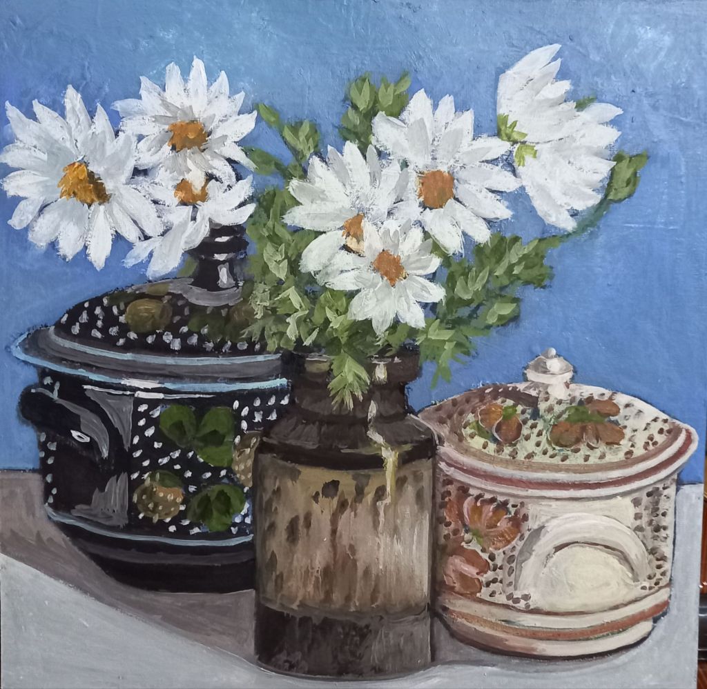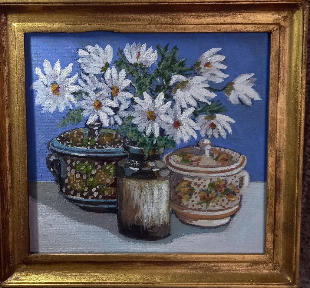 Mostly today I sorted out some canvas boards to fit the remaining frames, painted out some of the flowers on yesterday’s still life and painted another smaller one.